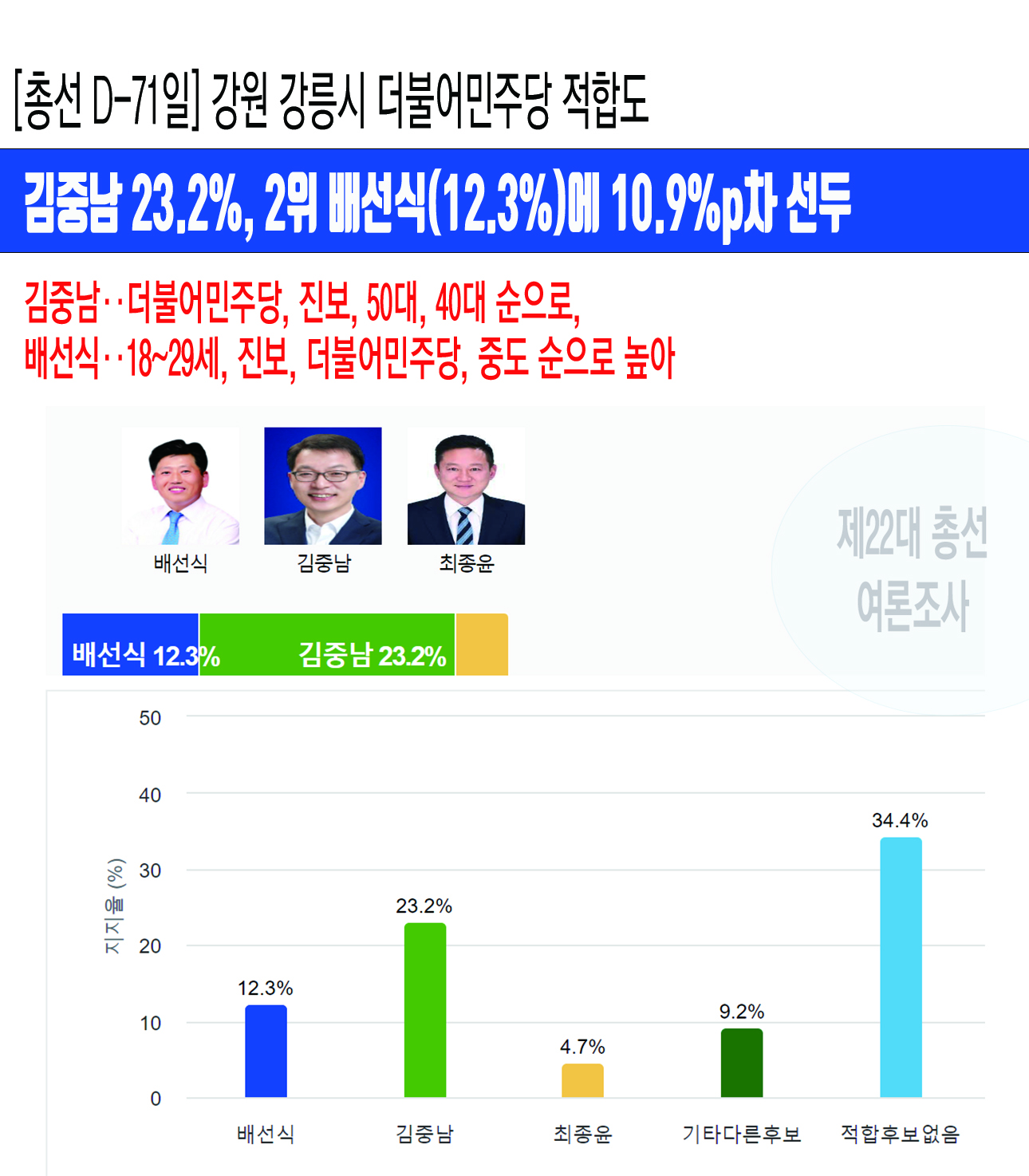 [ÃѼ± D-71ÀÏ] °¿ø °¸ª ´õºÒ¾î¹ÎÁÖ´ç ÀûÇÕµµ¡¤¡¤¡¤±èÁß³² 23.2%, 2À§ ¹è¼±½Ä(12.3%)¿¡ 10.9%pÂ÷ ¼±µÎ