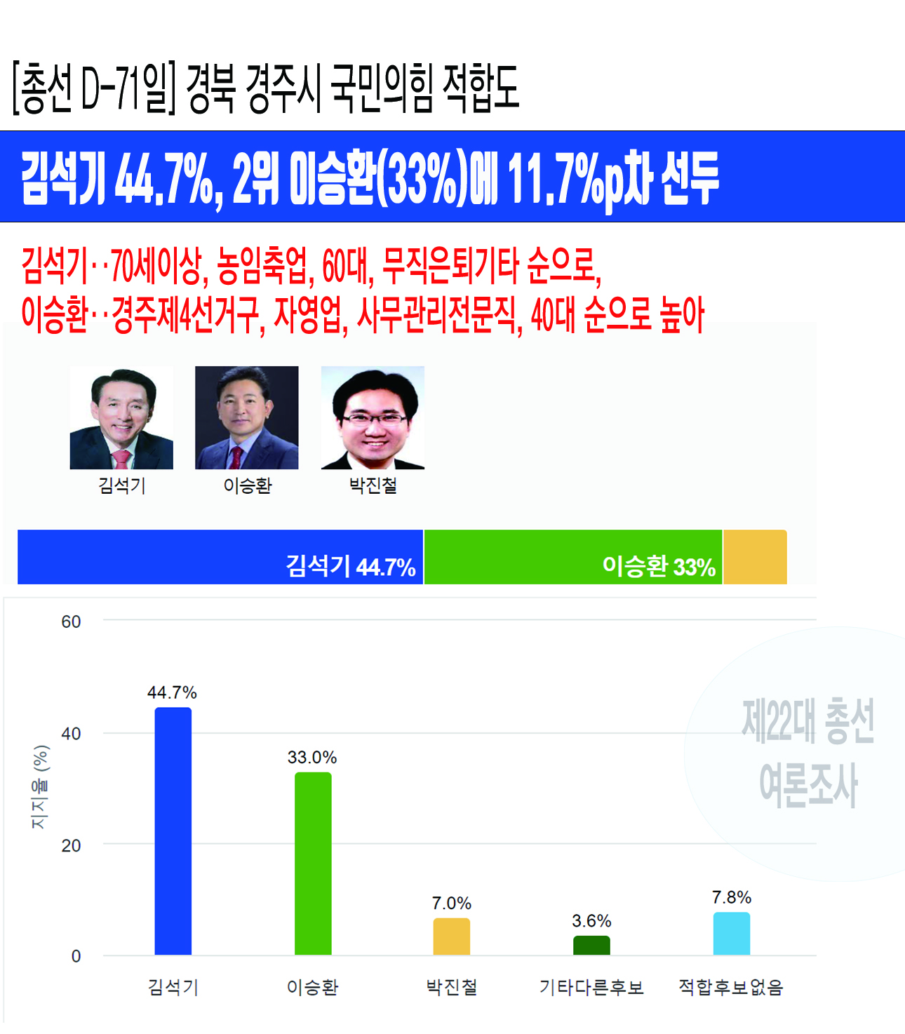[ÃѼ± D-71ÀÏ] °æºÏ °æÁֽà ±¹¹ÎÀÇÈû ÀûÇÕµµ¡¤¡¤¡¤±è¼®±â 44.7%, 2À§ À̽Âȯ(33%)¿¡ 11.7%pÂ÷ ¼±µÎ