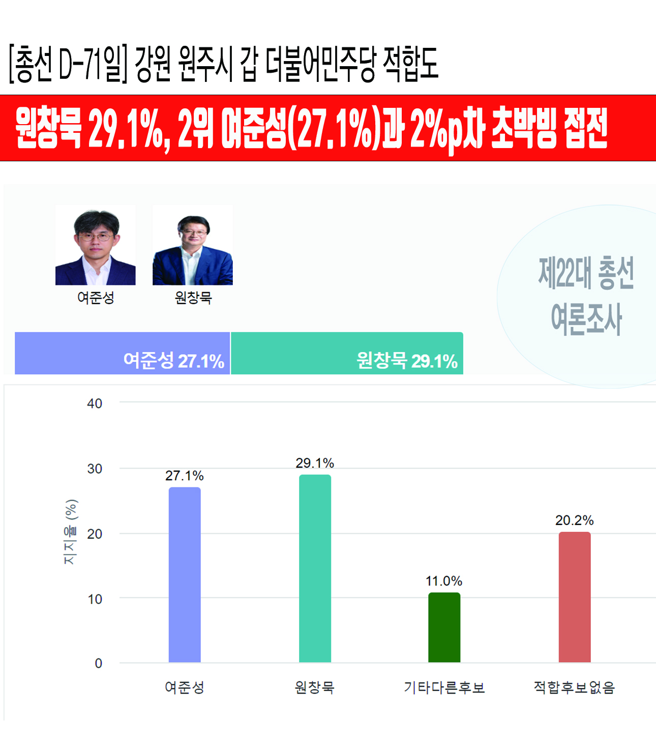 ³»³â Á¦22´ë ±¹È¸ÀÇ¿ø ¼±°Å¸¦ 71ÀÏ ¾ÕµÎ°í Á¶»çµÈ °¿øµµ ¿øÁֽà °© ¼±°Å±¸ ¡¸´õºÒ¾î¹ÎÁÖ´ç Èĺ¸ ÀûÇÕµµ¡¹¿©·ÐÁ¶»ç¿¡¼ '¿øÃ¢¹¬'°¡ 29.1%¸¦ ¾ò¾î 27.1%¸¦ ¾òÀº '¿©Áؼº'¿Í 2%p Â÷ÀÌ·Î ÃÊ ¹ÚºùÀÇ Á¢ÀüÀ» ¹úÀÌ´Â °ÍÀ¸·Î ³ªÅ¸³µ´Ù.