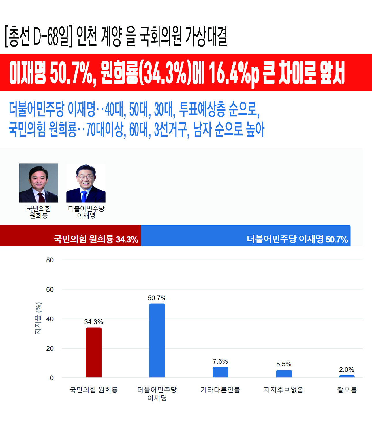 [ÃѼ± D-68ÀÏ] ÀÎõ °è¾ç À» ±¹È¸ÀÇ¿ø °¡»ó´ë°á¡¤¡¤¡¤ÀÌÀç¸í 50.7%, ¿øÈñ·æ(34.3%)¿¡ 16.4%p Å« Â÷ÀÌ·Î ¾Õ¼