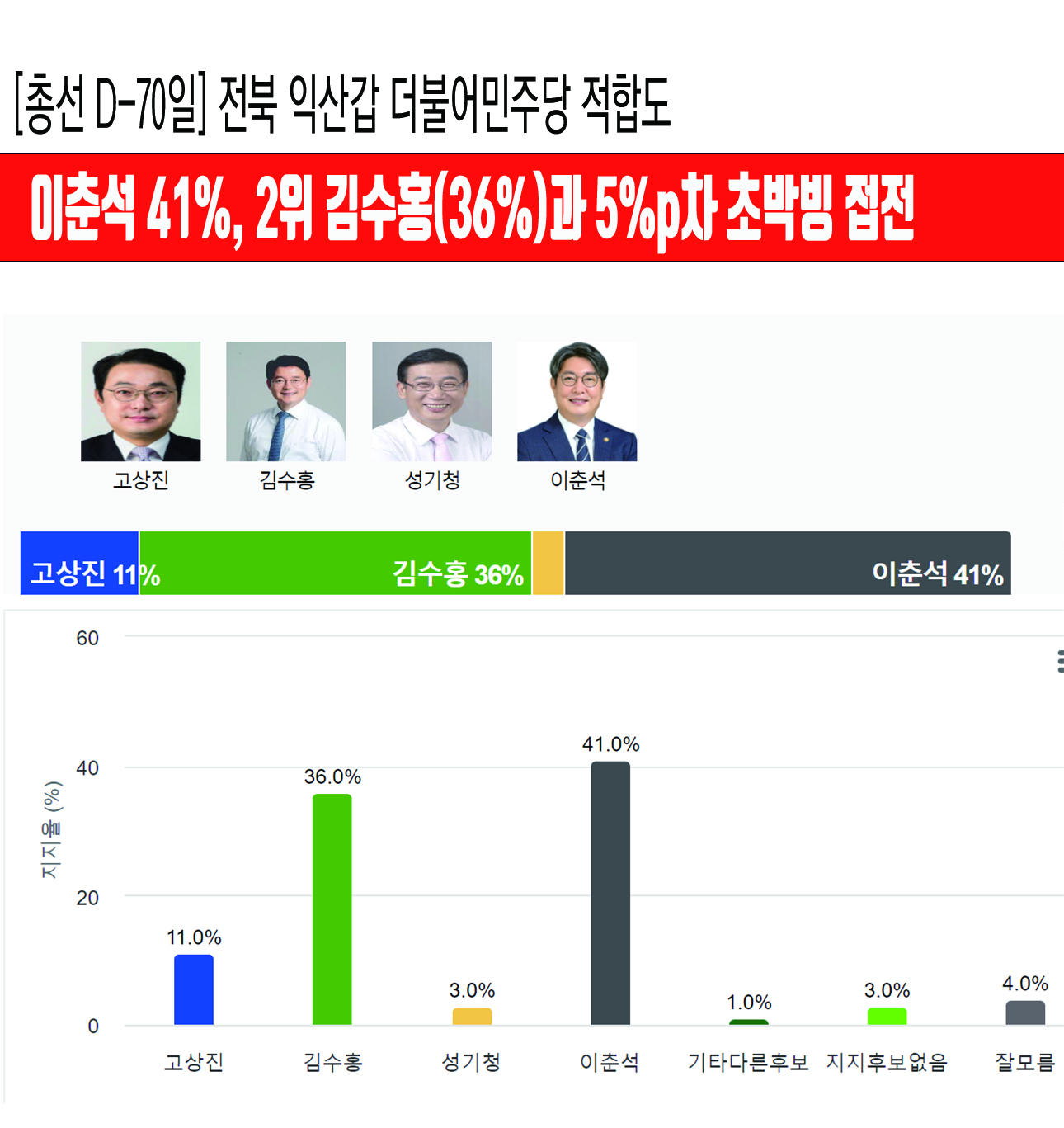 [ÃѼ± D-70ÀÏ] ÀüºÏ Àͻ갩 ´õºÒ¾î¹ÎÁÖ´ç ÀûÇÕµµ¡¤¡¤¡¤ÀÌÃá¼® 41%, 2À§ ±è¼öÈ«(36%)°ú 5%pÂ÷ Ãʹںù Á¢Àü