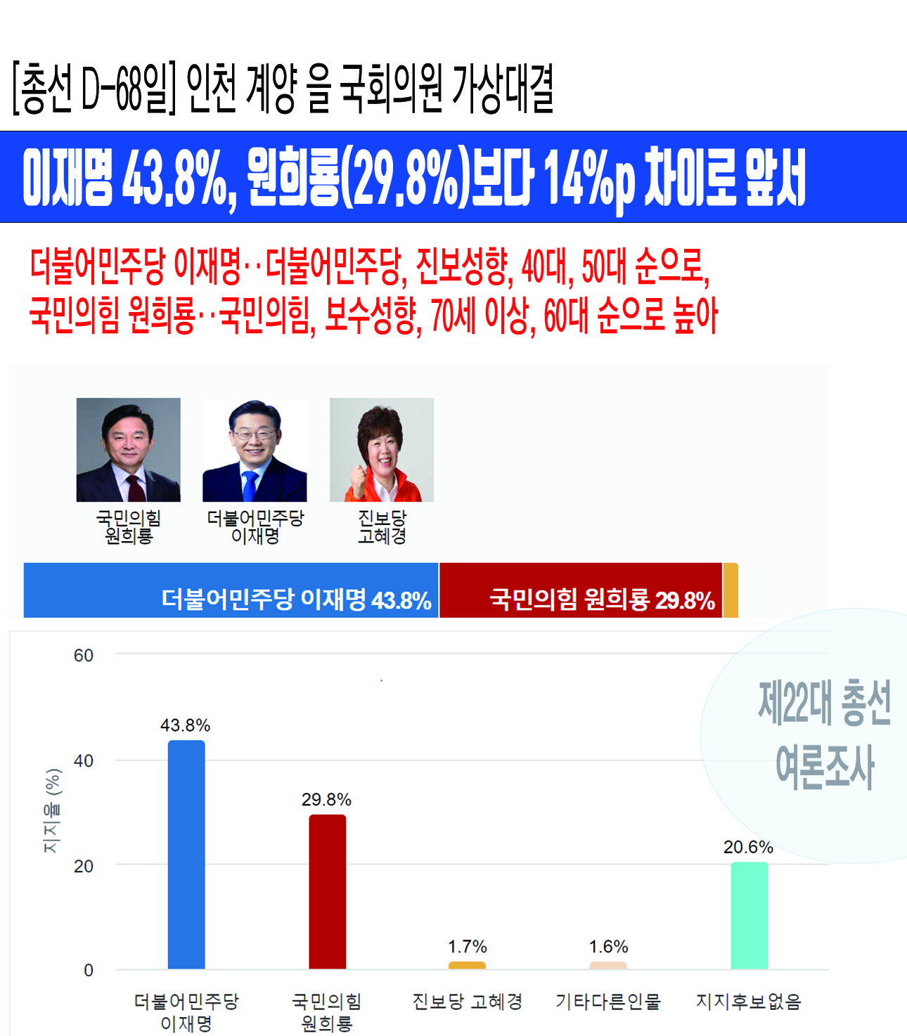 [ÃѼ± D-68ÀÏ] ÀÎõ °è¾ç À» ±¹È¸ÀÇ¿ø °¡»ó´ë°á¡¤¡¤¡¤ÀÌÀç¸í 43.8%, ¿øÈñ·æ(29.8%)º¸´Ù 14%p Â÷ÀÌ·Î ¾Õ¼