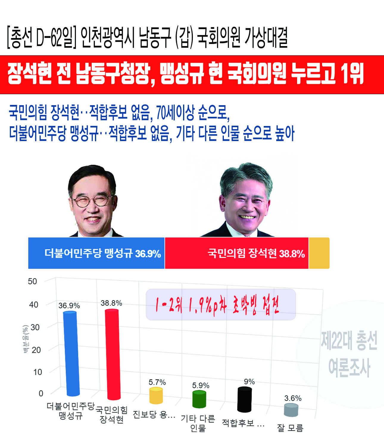 ³»³â Á¦22´ë ±¹È¸ÀÇ¿ø ¼±°Å¸¦ 62ÀÏ ¾ÕµÎ°í Á¶»çµÈ ÀÎõ±¤¿ª½Ã ³²µ¿±¸ °© ¼±°Å±¸ ¡¸³²µ¿°© ±¹È¸ÀÇ¿ø °¡»ó´ë°á¡¹¿©·ÐÁ¶»ç¿¡¼ ±¹¹ÎÀÇÈû Àå¼®Çö Àü ÀÎõ±¤¿ª½Ã ³²µ¿±¸Ã»ÀåÀÌ 38.8%¸¦ ¾ò¾î 36.9%¸¦ ¾òÀº ´õºÒ¾î¹ÎÁÖ´ç ¸Í¼º±Ô Çö Á¦21´ë ±¹È¸ÀÇ¿ø°ú 1.9%p Â÷ÀÌ·Î ÃÊ ¹ÚºùÀÇ Á¢ÀüÀ» ¹úÀÌ´Â °ÍÀ¸·Î ³ªÅ¸³µ´Ù.