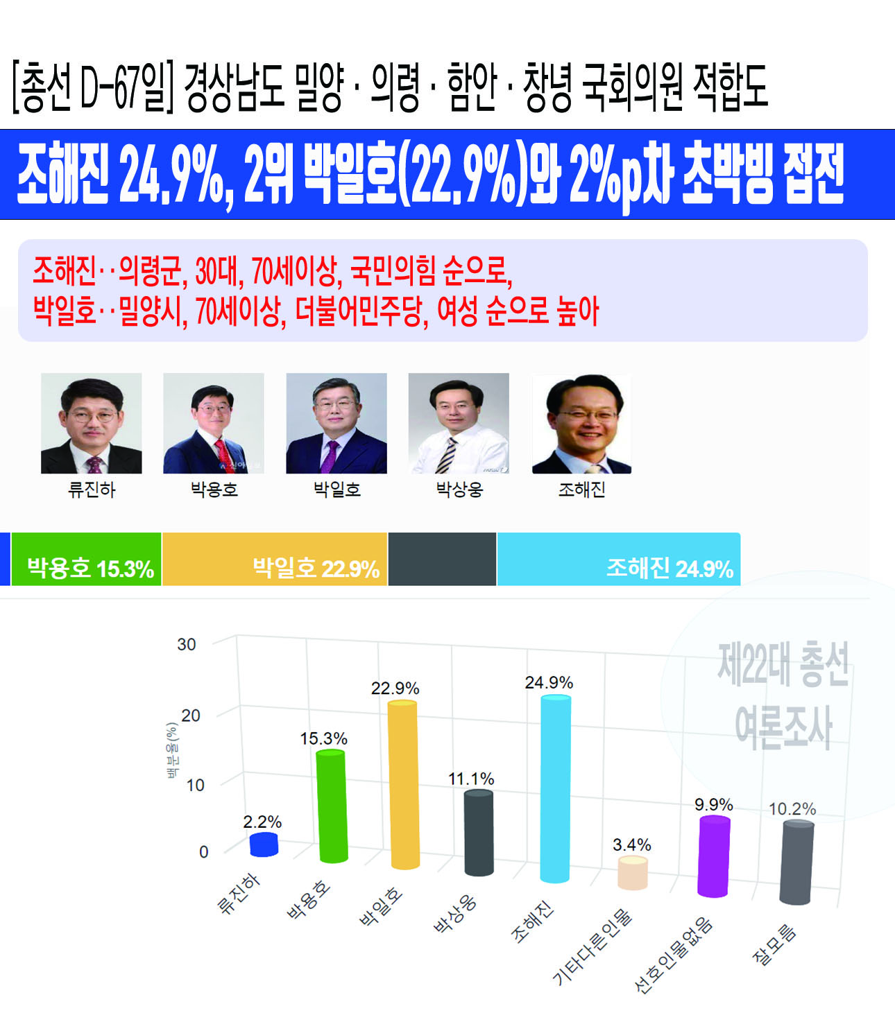 ³»³â Á¦22´ë ±¹È¸ÀÇ¿ø ¼±°Å¸¦ 67ÀÏ ¾ÕµÎ°í Á¶»çµÈ °æ»ó³²µµ ¹Ð¾ç½Ã ÀǷɱº ÇԾȱº â³ç±º ¼±°Å±¸ ¡¸±¹È¸ÀÇ¿ø Èĺ¸ ÀûÇÕµµ¡¹¿©·ÐÁ¶»ç¿¡¼ Á¶ÇØÁø Çö ±¹È¸ÀÇ¿øÀÌ 24.9%¸¦ ¾ò¾î 22.9%¸¦ ¾òÀº ¹ÚÀÏÈ£ Àü ´ëÅë·Éºñ¼½Ç ÇàÁ¤°ü°ú 2%p Â÷ÀÌ·Î ÃÊ ¹ÚºùÀÇ Á¢ÀüÀ» ¹úÀÌ´Â °ÍÀ¸·Î ³ªÅ¸³µ´Ù.