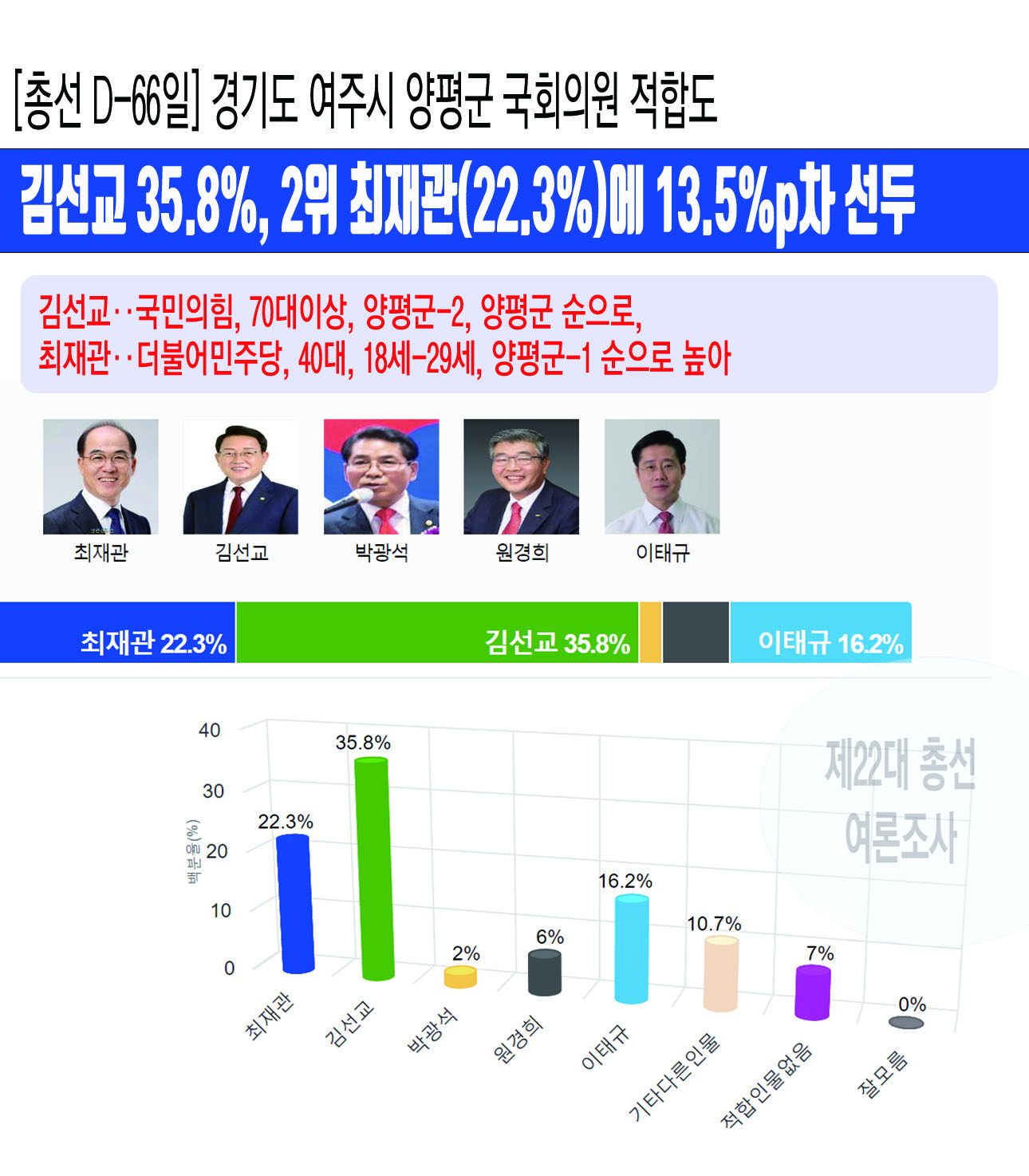 ³»³â Á¦22´ë ±¹È¸ÀÇ¿ø ¼±°Å¸¦ 66ÀÏ ¾ÕµÎ°í Á¶»çµÈ °æ±âµµ ¿©Áֽà ¾çÆò±º ¼±°Å±¸ ¡¸±¹È¸ÀÇ¿ø ÀûÇÕµµ¡¹¿©·ÐÁ¶»ç¿¡¼ ±è¼±±³ Àü ±¹È¸ÀÇ¿øÀÌ 35.8%¸¦ ¾ò¾î 22.3%¸¦ ¾òÀº ÃÖÀç°ü Àü û¿Í´ë ³ó¾î¾÷ºñ¼°üÀ» 13.5%pÀÇ Â÷ÀÌ·Î ¾Õ¼ ³ª°¡´Â °ÍÀ¸·Î ³ª¿Ô´Ù.