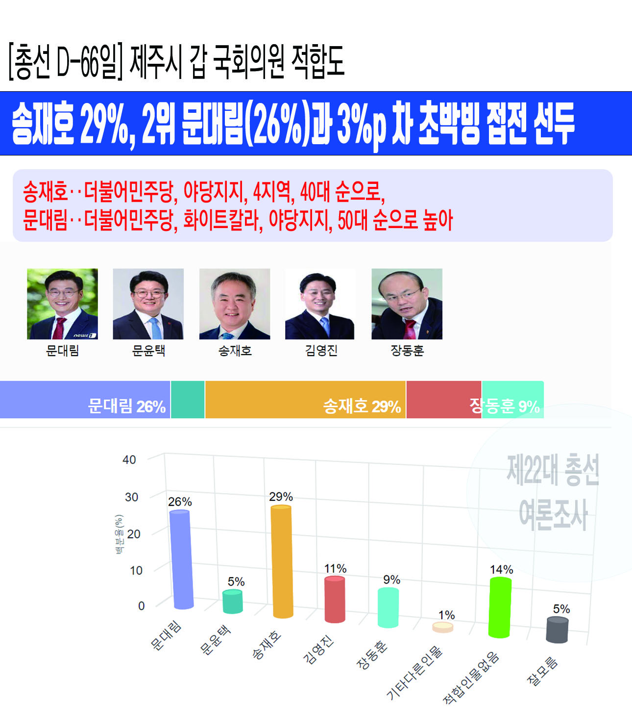 [ÃѼ± D-66ÀÏ] Á¦Áֽà °© ±¹È¸ÀÇ¿ø¡¤¡¤¡¤¼ÛÀçÈ£ 29%, 2À§ ¹®´ë¸²(26%)°ú 3%p Â÷ Ãʹںù Á¢Àü ¼±µÎ