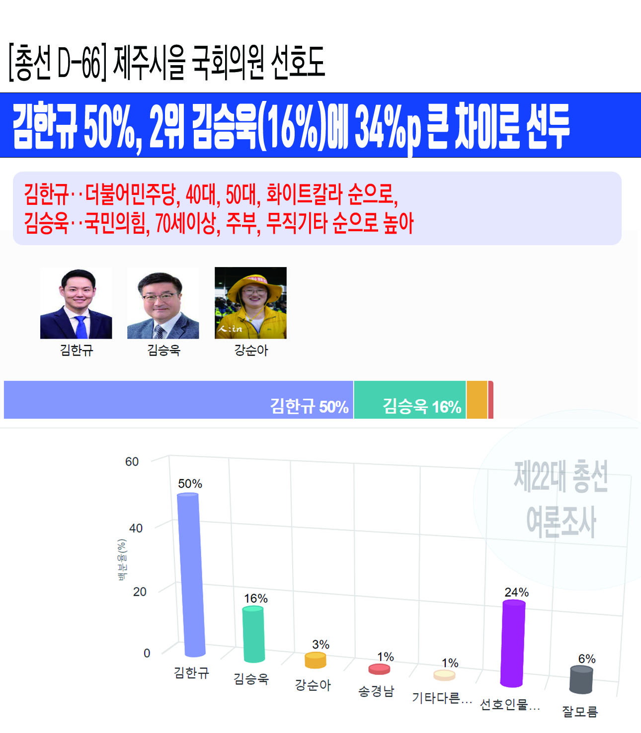 ³»³â Á¦22´ë ±¹È¸ÀÇ¿ø ¼±°Å¸¦ 66ÀÏ ¾ÕµÎ°í Á¶»çµÈ Á¦ÁÖµµ Á¦Áֽà À» ¼±°Å±¸ ¡¸±¹È¸ÀÇ¿ø ¼±È£µµ¡¹¿©·ÐÁ¶»ç¿¡¼ ±èÇÑ±Ô Çö ±¹È¸ÀÇ¿øÀÌ 50%¸¦ ¾ò¾î 16%¸¦ ¾òÀº ±è½Â¿í Àü ±¹¹ÎÀÇÈû Á¦ÁÖ½ÃÀ» ´çÇùÀ§¿øÀåÀ» 34%pÀÇ Å« Â÷ÀÌ·Î ¾Õ¼ ³ª°¡´Â °ÍÀ¸·Î ³ª¿Ô´Ù.