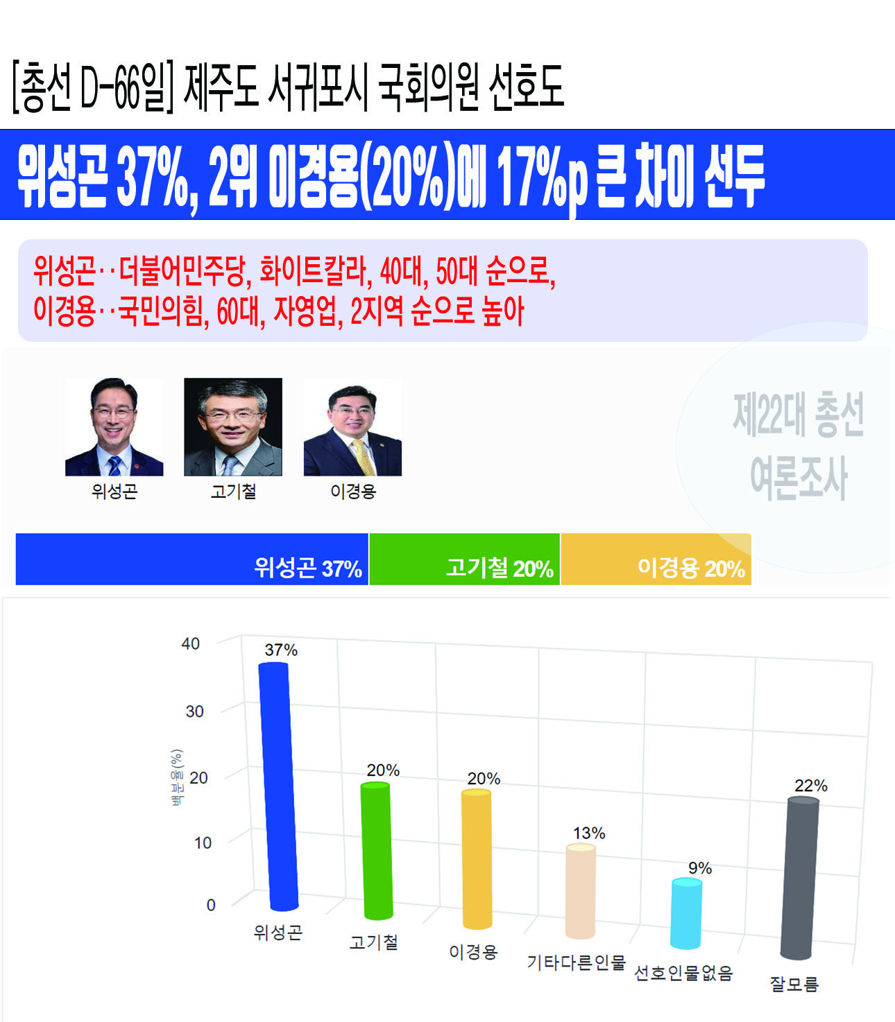 [ÃѼ± D-66ÀÏ] Á¦ÁÖµµ ¼±ÍÆ÷½Ã ±¹È¸ÀÇ¿ø ¼±È£µµ¡¤¡¤¡¤À§¼º°ï 37%, 2À§ À̰æ¿ë(20%)¿¡ 17%p Å« Â÷ÀÌ ¼±µÎ