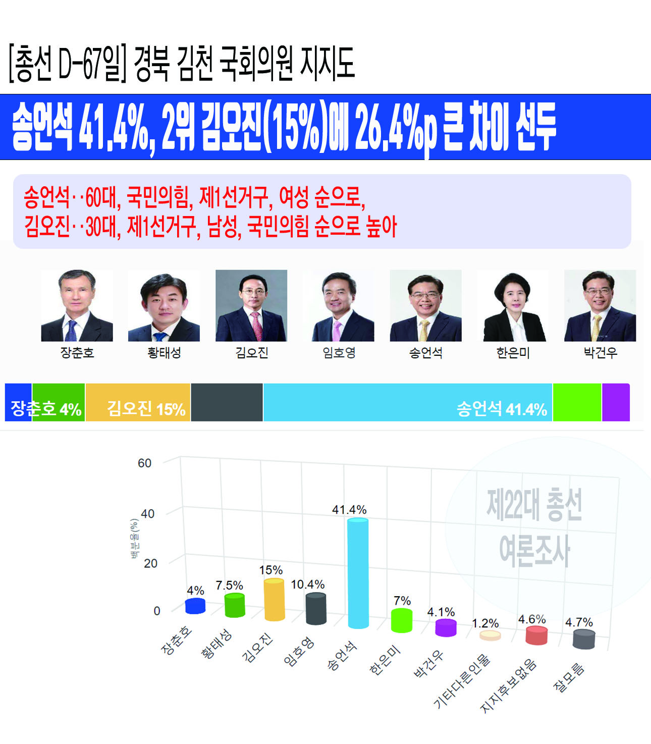 [ÃѼ± D-67ÀÏ] °æºÏ ±èõ ±¹È¸ÀÇ¿ø¡¤¡¤¡¤¼Û¾ð¼® 41.4%, 2À§ ±è¿ÀÁø(15%)¿¡ 26.4%p Å« Â÷ÀÌ ¼±µÎ