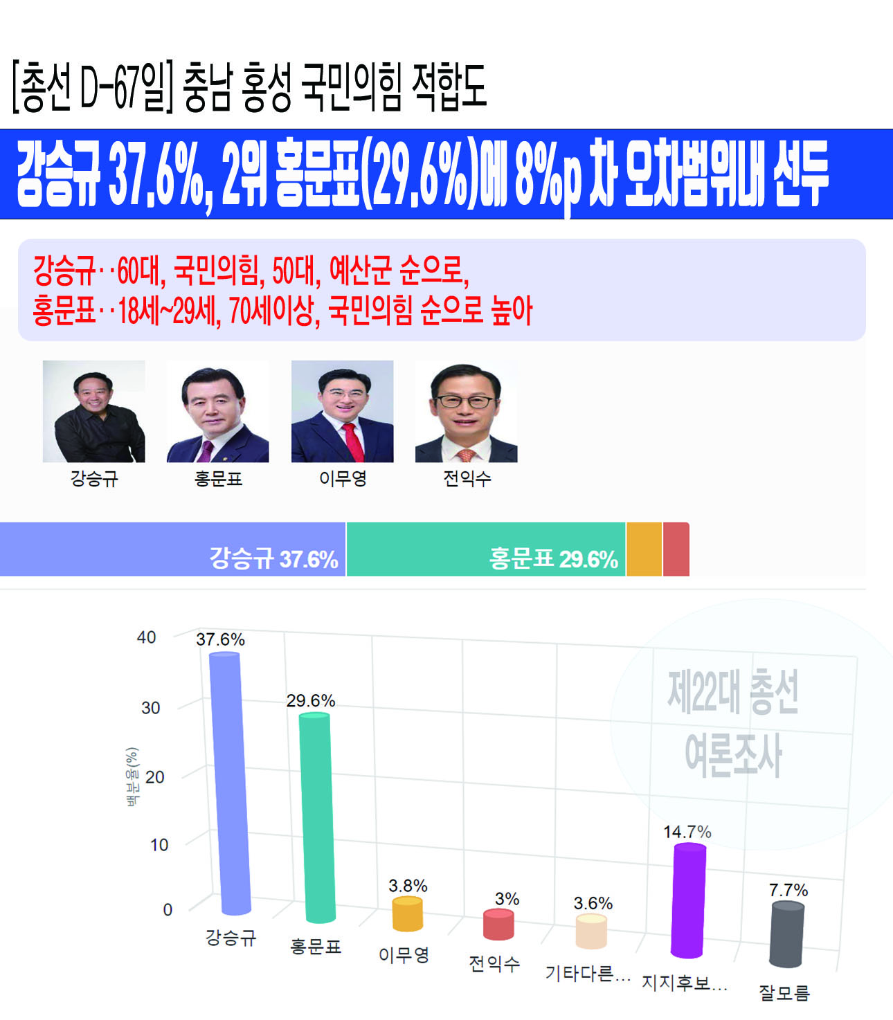 ³»³â Á¦22´ë ±¹È¸ÀÇ¿ø ¼±°Å¸¦ 67ÀÏ ¾ÕµÎ°í Á¶»çµÈ ÃæÃ»³²µµ È«¼º±º ¿¹»ê±º ¼±°Å±¸ ¡¸±¹¹ÎÀÇÈû Èĺ¸ ÀûÇÕµµ¡¹¿©·ÐÁ¶»ç¿¡¼ °½Â±Ô Àü À±¼®¿ ´ëÅë·Éºñ¼½Ç ½Ã¹Î»çȸ¼ö¼®ºñ¼°üÀÌ 37.6%¸¦ ¾ò¾î 29.6%¸¦ ¾òÀº ±¹¹ÎÀÇÈû È«¹®Ç¥ Çö ±¹È¸ÀÇ¿øÀ» 8%pÀÇ Â÷ÀÌ·Î ¾Õ¼ ³ª°¡´Â °ÍÀ¸·Î ³ª¿Ô´Ù.