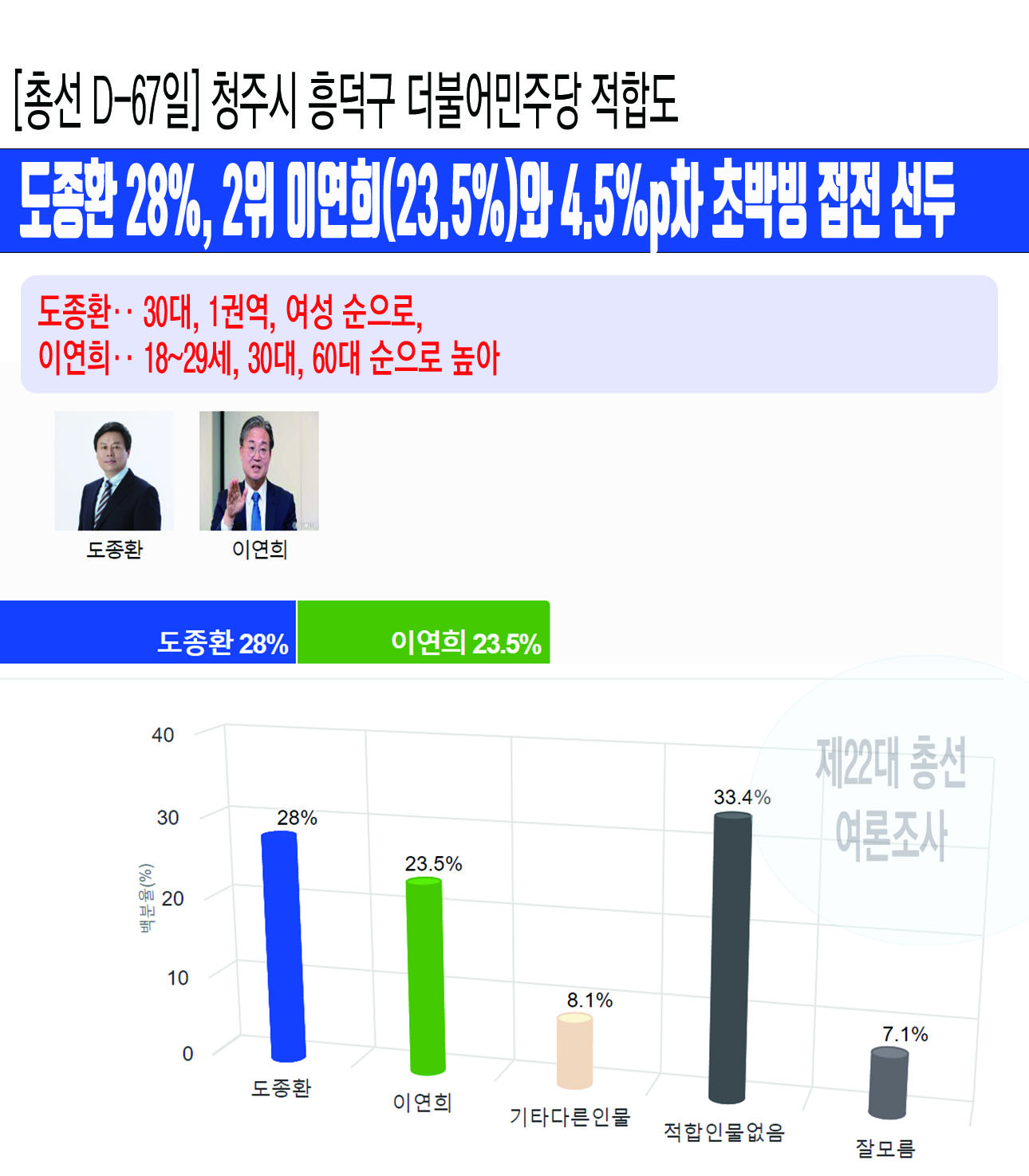³»³â Á¦22´ë ±¹È¸ÀÇ¿ø ¼±°Å¸¦ 67ÀÏ ¾ÕµÎ°í Á¶»çµÈ ÃæÃ»ºÏµµ ûÁֽà Èï´ö±¸ ¼±°Å±¸ ¡¸´õºÒ¾î¹ÎÁÖ´ç Èĺ¸ÀûÇÕµµ¡¹¿©·ÐÁ¶»ç¿¡¼ 'µµÁ¾È¯' È帰¡ 28%¸¦ ¾ò¾î 23.5%¸¦ ¾òÀº 'ÀÌ¿¬Èñ' Èĺ¸¿Í 4.5%p Â÷ÀÌ·Î ÃÊ Á¢ÀüÀ» ¹úÀÌ´Â °ÍÀ¸·Î ³ªÅ¸³µ´Ù.