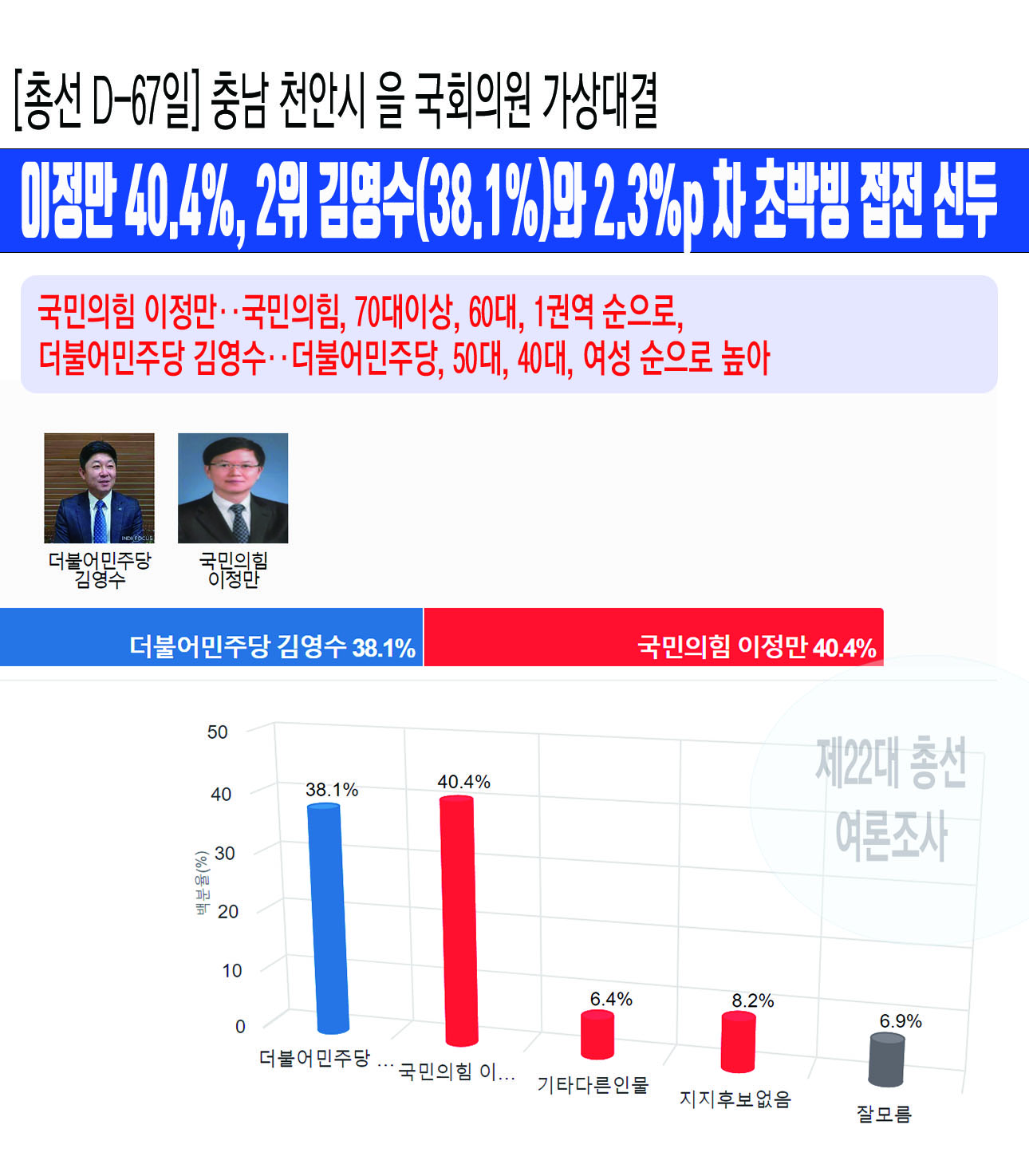 ³»³â Á¦22´ë ±¹È¸ÀÇ¿ø ¼±°Å¸¦ 67ÀÏ ¾ÕµÎ°í Á¶»çµÈ ÃæÃ»³²µµ õ¾È½Ã À» ¼±°Å±¸ ¡¸±è¿µ¼ö vs ÀÌÁ¤¸¸ °¡»ó´ë°á¡¹¿©·ÐÁ¶»ç¿¡¼­ ±¹¹ÎÀÇÈû ÀÌÁ¤¸¸ Çö ±¹¹ÎÀÇÈû õ¾È½Ã À» ´çÇùÀ§¿øÀåÀÌ 40.4%¸¦ ¾ò¾î 38.1%¸¦ ¾òÀº ´õºÒ¾î¹ÎÁÖ´ç ±è¿µ¼ö Çö ´õºÒ¾î¹ÎÁÖ´ç ÃæÃ»³²µµ´ç û³âÀ§¿øÀå°ú 2.3%p Â÷ÀÌ·Î ÃÊ ¹ÚºùÀÇ Á¢ÀüÀ» ¹úÀÌ´Â °ÍÀ¸·Î ³ªÅ¸³µ´Ù.
