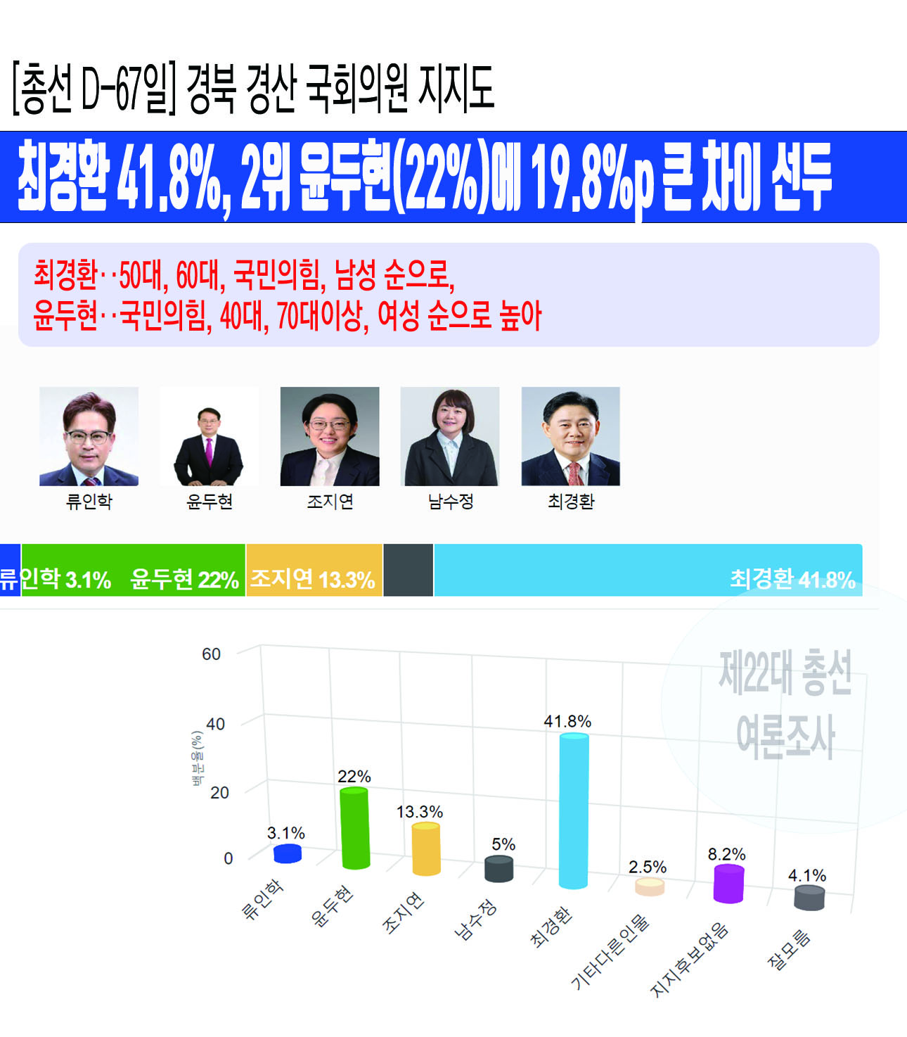 [ÃѼ± D-67ÀÏ] °æºÏ °æ»ê ±¹È¸ÀÇ¿ø ÁöÁöµµ¡¤¡¤¡¤ÃÖ°æÈ¯ 41.8%, 2À§ À±µÎÇö(22%)¿¡ 19.8%p Å« Â÷ÀÌ ¼±µÎ