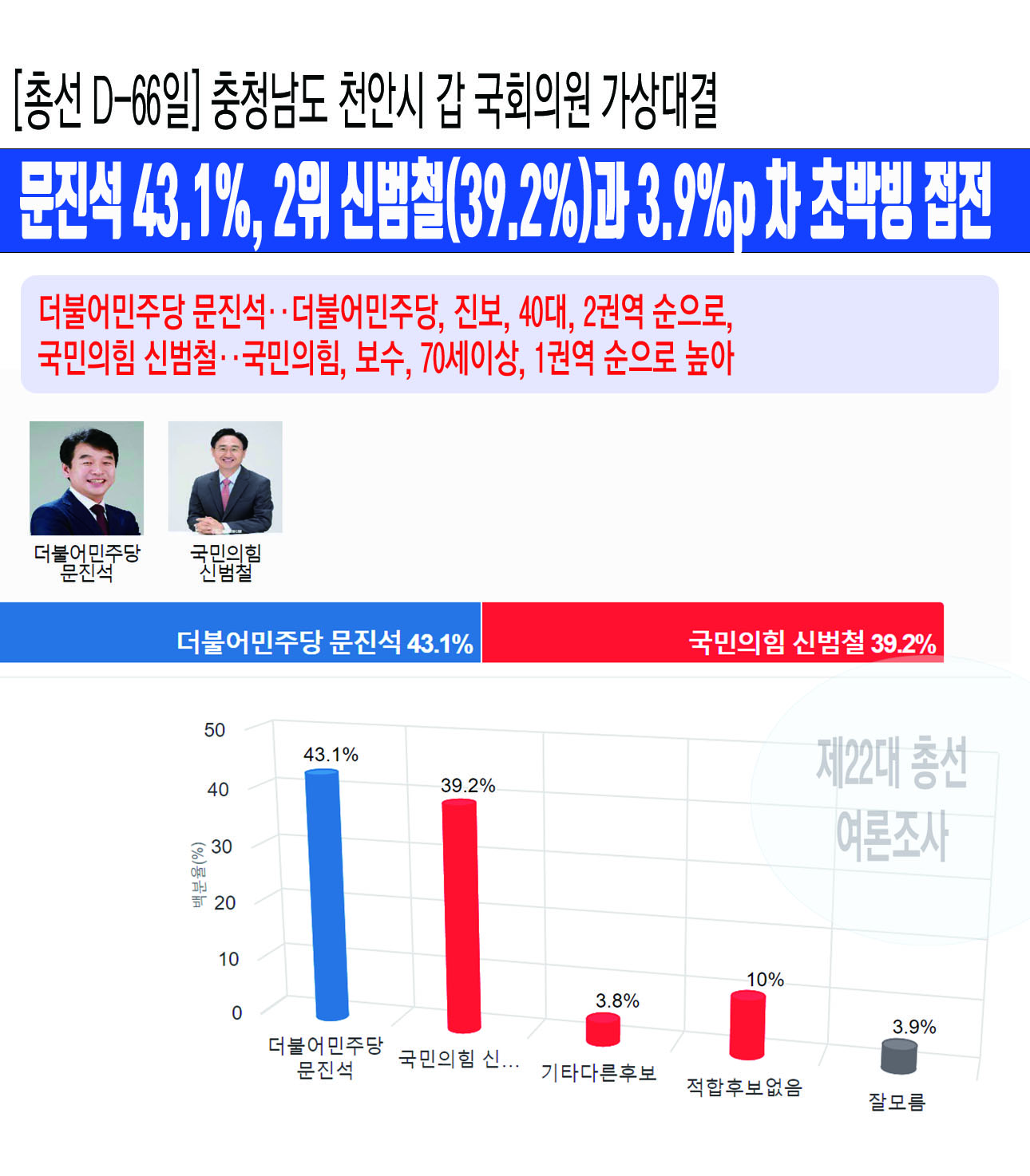³»³â Á¦22´ë ±¹È¸ÀÇ¿ø ¼±°Å¸¦ 66ÀÏ ¾ÕµÎ°í Á¶»çµÈ ÃæÃ»³²µµ õ¾È½Ã°© ¼±°Å±¸ ¡¸¹®Áø¼® vs. ½Å¹üö °¡»ó´ë°á¡¹¿©·ÐÁ¶»ç¿¡¼ ´õºÒ¾î¹ÎÁÖ´ç ¹®Áø¼® È帰¡ 43.1%¸¦ ¾ò¾î 39.2%¸¦ ¾òÀº ±¹¹ÎÀÇÈû ½Å¹üö Èĺ¸¿Í 3.9%p Â÷ÀÌ·Î ÃÊ Á¢ÀüÀ» ¹úÀÌ´Â °ÍÀ¸·Î ³ªÅ¸³µ´Ù.