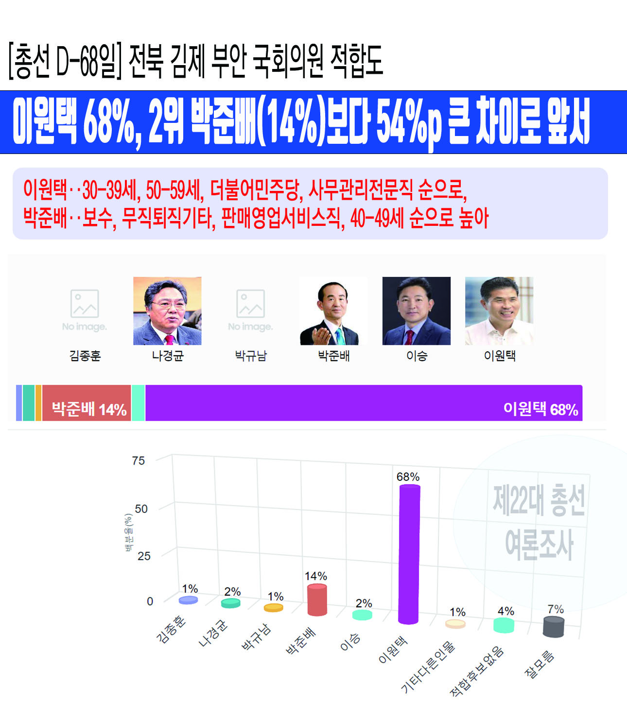 [ÃѼ± D-68ÀÏ] ÀüºÏ ±èÁ¦ ºÎ¾È ±¹È¸ÀÇ¿ø ÀûÇÕµµ¡¤¡¤¡¤ÀÌ¿øÅà 68%, 2À§ ¹ÚÁعè(14%)º¸´Ù 54%p Å« Â÷ÀÌ·Î ¾Õ¼