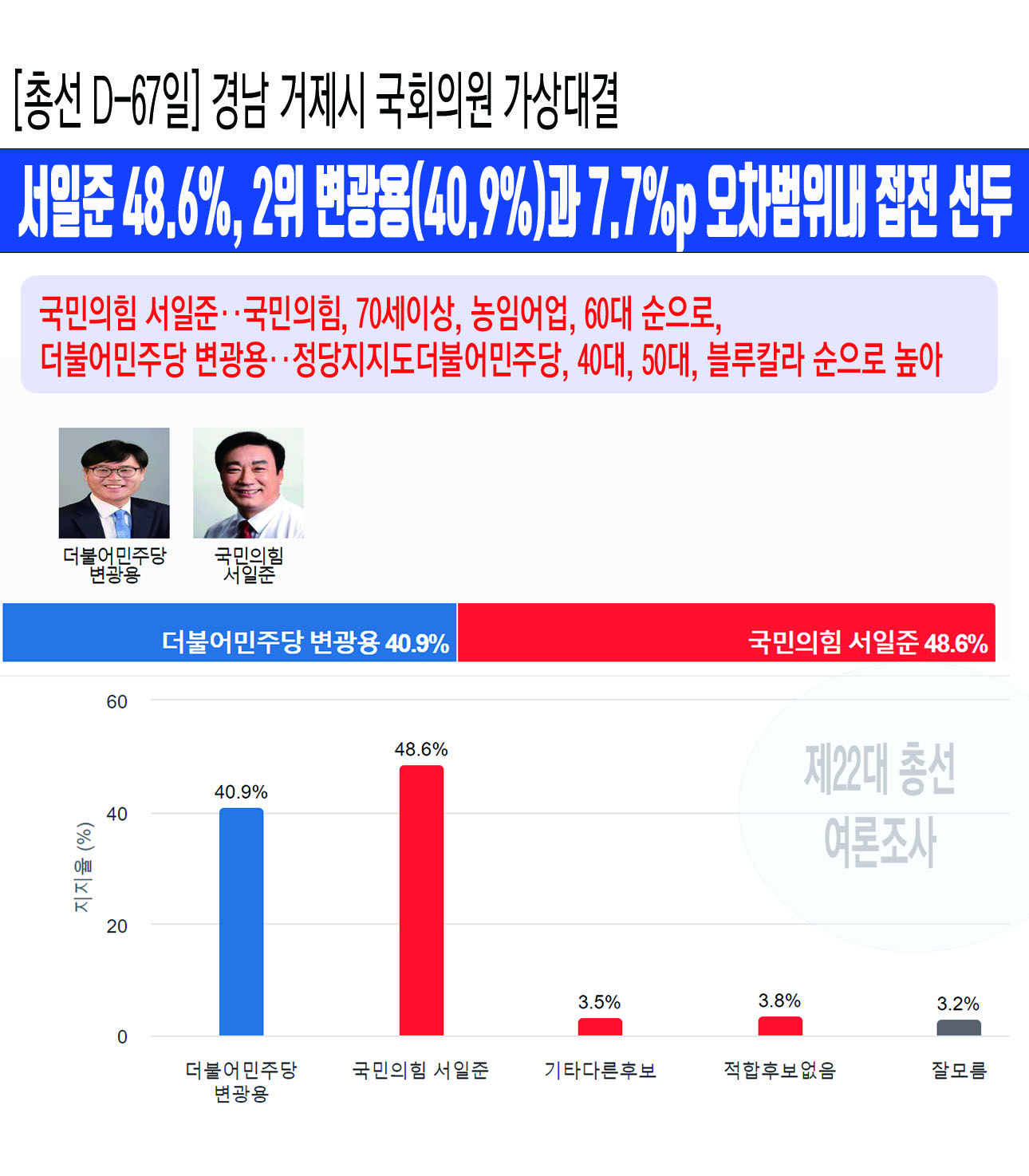 [ÃѼ± D-67ÀÏ] °æ³² °ÅÁ¦½Ã ±¹È¸ÀÇ¿ø °¡»ó´ë°á¡¤¡¤¡¤±¹¹ÎÀÇÈû ¼ÀÏÁØ 48.6%, 2À§ ´õºÒ¾î¹ÎÁÖ´ç º¯±¤¿ë(40.9%)°ú 7.7%p ¿ÀÂ÷¹üÀ§³» Á¢Àü 1À§