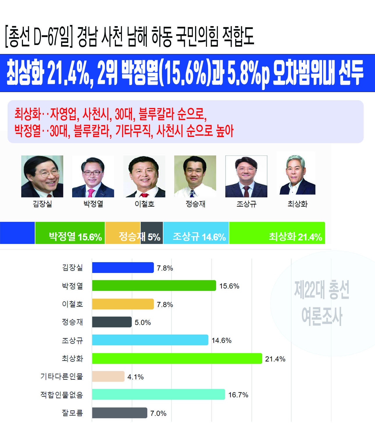 ³»³â Á¦22´ë ±¹È¸ÀÇ¿ø ¼±°Å¸¦ 67ÀÏ ¾ÕµÎ°í Á¶»çµÈ °æ»ó³²µµ »çõ½Ã ³²Çرº Çϵ¿±º ¼±°Å±¸ ¡¸±¹¹ÎÀÇÈû Èĺ¸ÀûÇÕµµ¡¹¿©·ÐÁ¶»ç¿¡¼ 'ÃÖ»óÈ' È帰¡ 21.4%¸¦ ¾ò¾î 15.6%¸¦ ¾òÀº ¹ÚÁ¤¿ °æ³²µµÀÇȸ ÀÇ¿ø°ú 5.8%p Â÷ÀÌ·Î ¿ÀÂ÷¹üÀ§³» Á¢ÀüÀ» ¹úÀÌ´Â °ÍÀ¸·Î ³ªÅ¸³µ´Ù.
