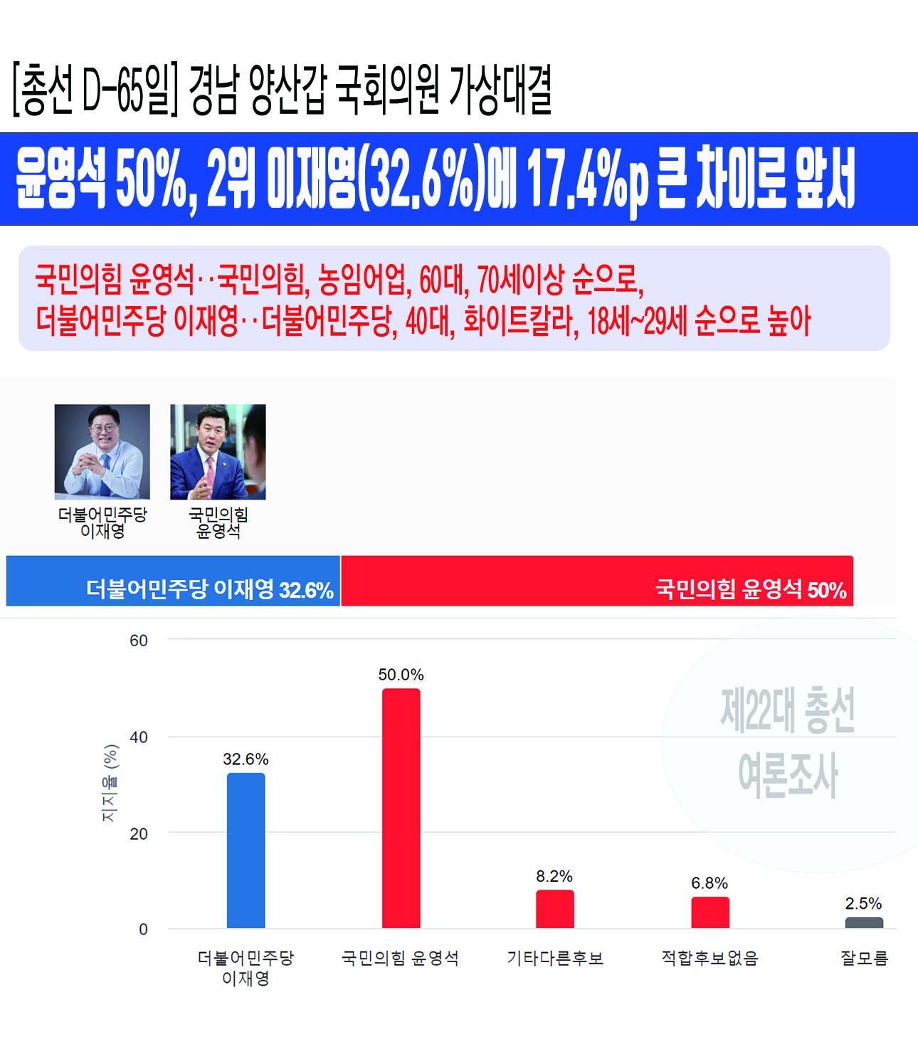 [ÃѼ± D-65ÀÏ] °æ³² ¾ç»ê°© ±¹È¸ÀÇ¿ø °¡»ó´ë°á¡¤¡¤¡¤±¹¹ÎÀÇÈû À±¿µ¼® 50%, 2À§ ´õºÒ¾î¹ÎÁÖ´ç ÀÌÀ翵(32.6%)¿¡ 17.4%p Å« Â÷ÀÌ·Î ¾Õ¼