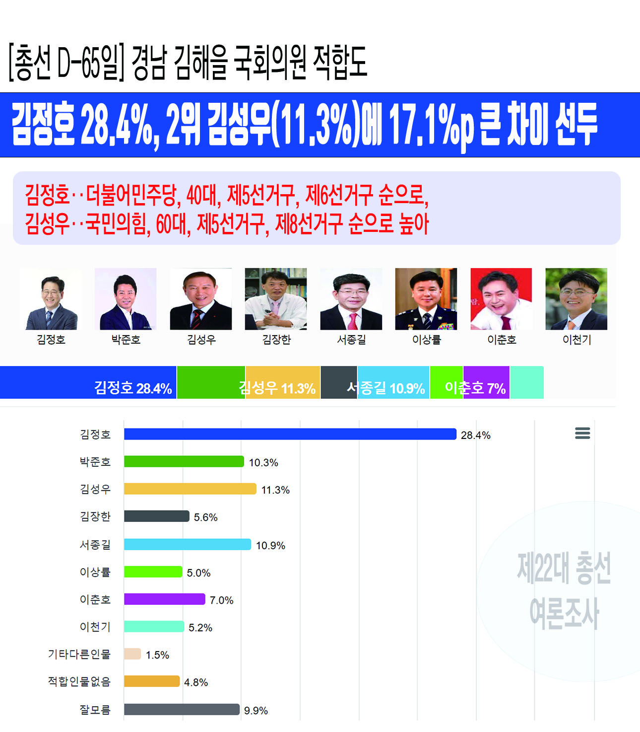 [ÃѼ± D-65ÀÏ] °æ³² ±èÇØÀ» ±¹È¸ÀÇ¿ø ÀûÇÕµµ¡¤¡¤¡¤±èÁ¤È£ 28.4%, 2À§ ±è¼º¿ì(11.3%)¿¡ 17.1%p Å« Â÷ÀÌ ¼±µÎ