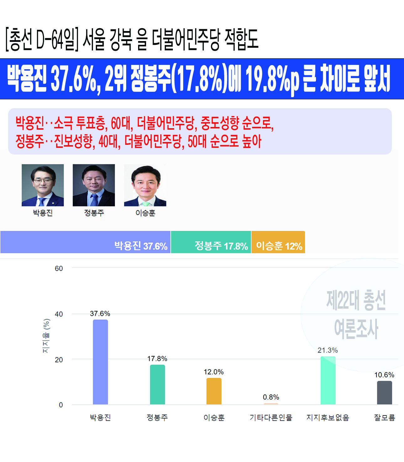 ³»³â Á¦22´ë ±¹È¸ÀÇ¿ø ¼±°Å¸¦ 64ÀÏ ¾ÕµÎ°í Á¶»çµÈ ¼¿ïƯº°½Ã °ºÏ±¸ À» ¼±°Å±¸ ¡¸°ºÏ(À») ´õºÒ¾î¹ÎÁÖ´ç Èĺ¸ ÀûÇÕµµ¡¹¿©·ÐÁ¶»ç¿¡¼ ¹Ú¿ëÁø Çö ±¹È¸ÀÇ¿øÀÌ 37.6%¸¦ ¾ò¾î 17.8%¸¦ ¾òÀº Á¤ºÀÁÖ Àü ±¹È¸ÀÇ¿øÀ» 19.8%pÀÇ Å« Â÷ÀÌ·Î ¾Õ¼ ³ª°¡´Â °ÍÀ¸·Î ³ª¿Ô´Ù.