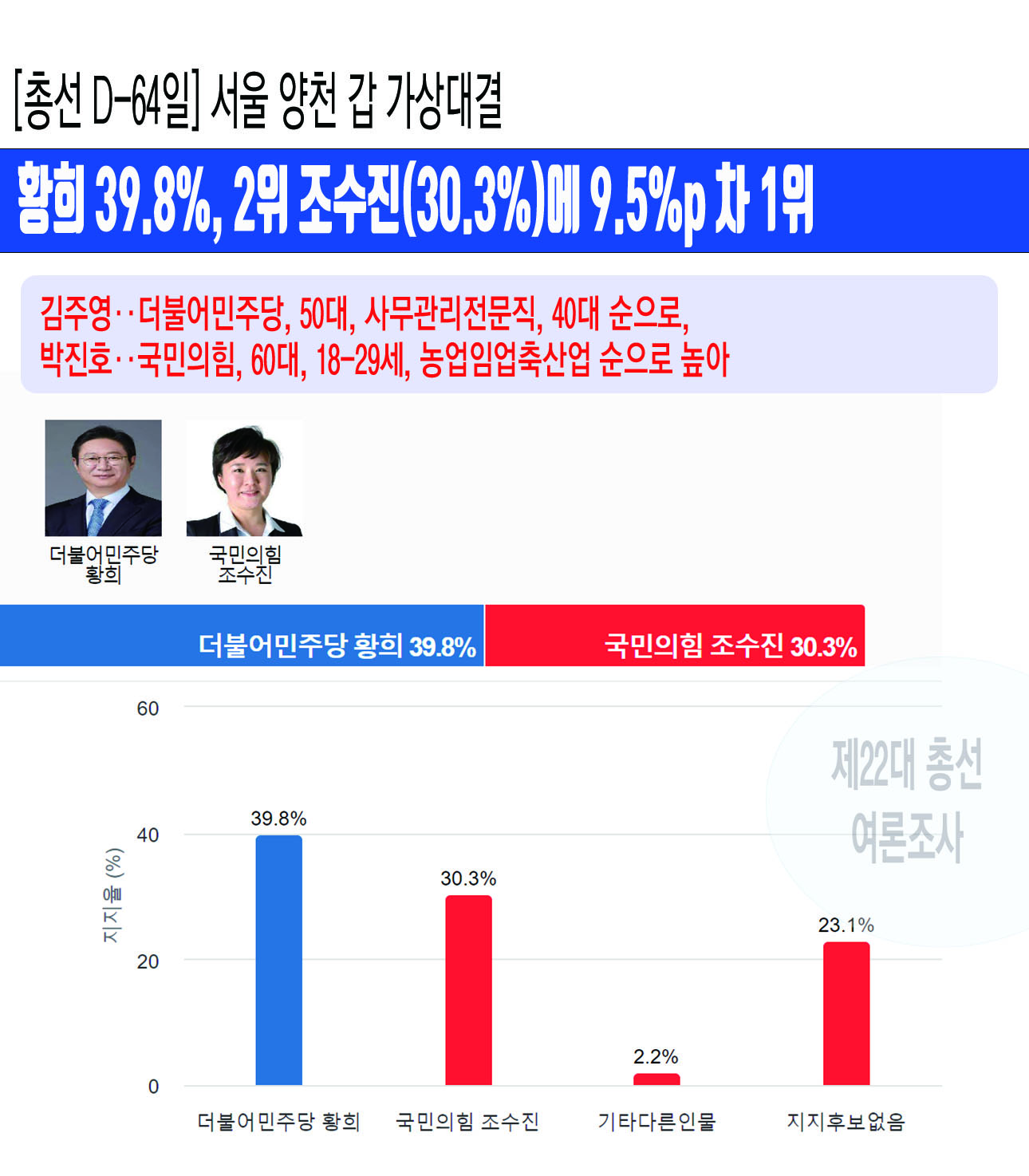 ³»³â Á¦22´ë ±¹È¸ÀÇ¿ø ¼±°Å¸¦ 64ÀÏ ¾ÕµÎ°í Á¶»çµÈ ¼­¿ïƯº°½Ã ¾çõ±¸ °© ¼±°Å±¸ ¡¸È²Èñ vs Á¶¼öÁø °¡»ó´ë°á¡¹¿¡¼­ ´õºÒ¾î¹ÎÁÖ´ç ȲÈñ È帰¡ 39.8%¸¦ ¾ò¾î 30.3%¸¦ ¾òÀº ±¹¹ÎÀÇÈû Á¶¼öÁø È常¦ 9.5%pÀÇ Å« Â÷ÀÌ·Î ¾Õ¼­ ³ª°¡´Â °ÍÀ¸·Î ³ª¿Ô´Ù.