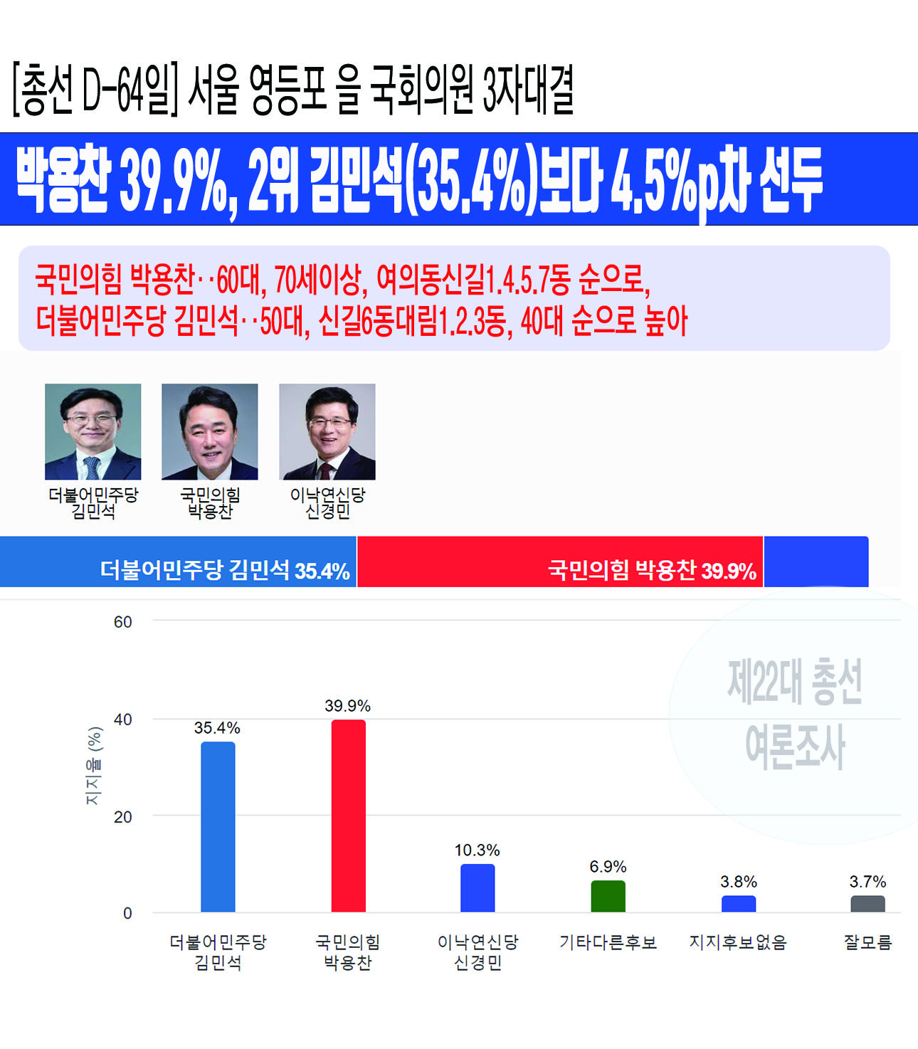 [ÃѼ± D-64ÀÏ] ¼¿ï ¿µµîÆ÷ À» ±¹È¸ÀÇ¿ø 3ÀÚ´ë°á¡¤¡¤¡¤¹Ú¿ëÂù 39.9%, 2À§ ±è¹Î¼®(35.4%)º¸´Ù 4.5%pÂ÷ ¼±µÎ