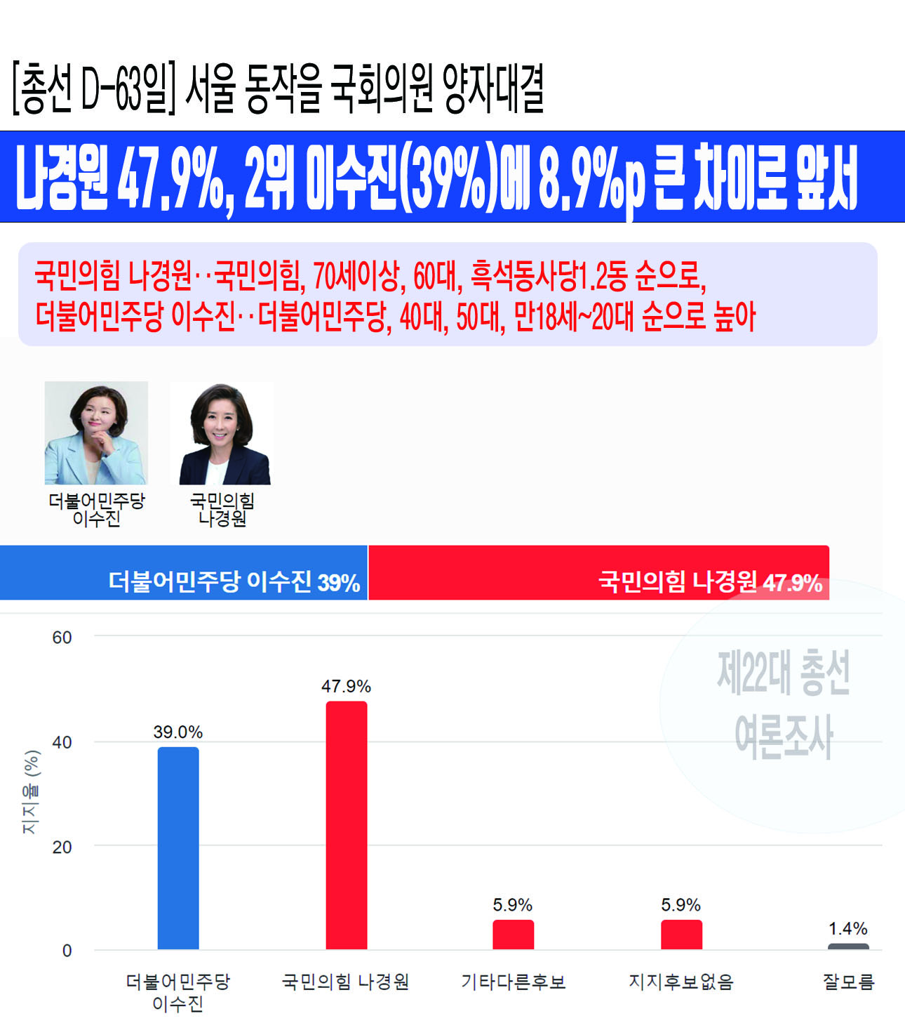 ³»³â Á¦22´ë ±¹È¸ÀÇ¿ø ¼±°Å¸¦ 63ÀÏ ¾ÕµÎ°í Á¶»çµÈ ¼¿ïƯº°½Ã µ¿ÀÛ±¸ À» ¼±°Å±¸ ¡¸À̼öÁø vs ³ª°æ¿ø ¾çÀÚ´ë°á¡¹¿©·ÐÁ¶»ç¿¡¼ ±¹¹ÎÀÇÈû ³ª°æ¿ø Àü ±¹È¸ÀÇ¿øÀÌ 47.9%¸¦ ¾ò¾î 39%¸¦ ¾òÀº ´õºÒ¾î¹ÎÁÖ´ç À̼öÁø Çö ±¹È¸ÀÇ¿øÀ» 8.9%pÀÇ Å« Â÷ÀÌ·Î ¾Õ¼ ³ª°¡´Â °ÍÀ¸·Î ³ª¿Ô´Ù.