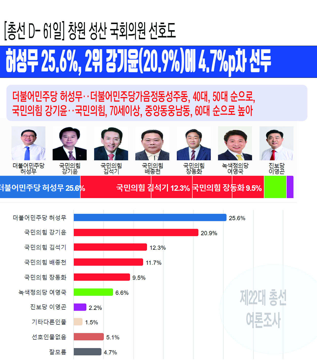 ³»³â Á¦22´ë ±¹È¸ÀÇ¿ø ¼±°Å¸¦ 61ÀÏ ¾ÕµÎ°í Á¶»çµÈ °æ»ó³²µµ â¿ø½Ã ¼º»ê±¸ ¼±°Å±¸ ¡¸±¹È¸ÀÇ¿ø ¼±È£µµ¡¹¿©·ÐÁ¶»ç¿¡¼ ´õºÒ¾î¹ÎÁÖ´ç Ç㼺¹« Àü â¿ø½ÃÀåÀÌ 25.6%¸¦ ¾ò¾î 20.9%¸¦ ¾òÀº ±¹¹ÎÀÇÈû °±âÀ± Çö ±¹È¸ÀÇ¿ø°ú 4.7%p Â÷ÀÌ·Î Á¢ÀüÀ» ¹úÀÌ´Â °ÍÀ¸·Î ³ªÅ¸³µ´Ù.