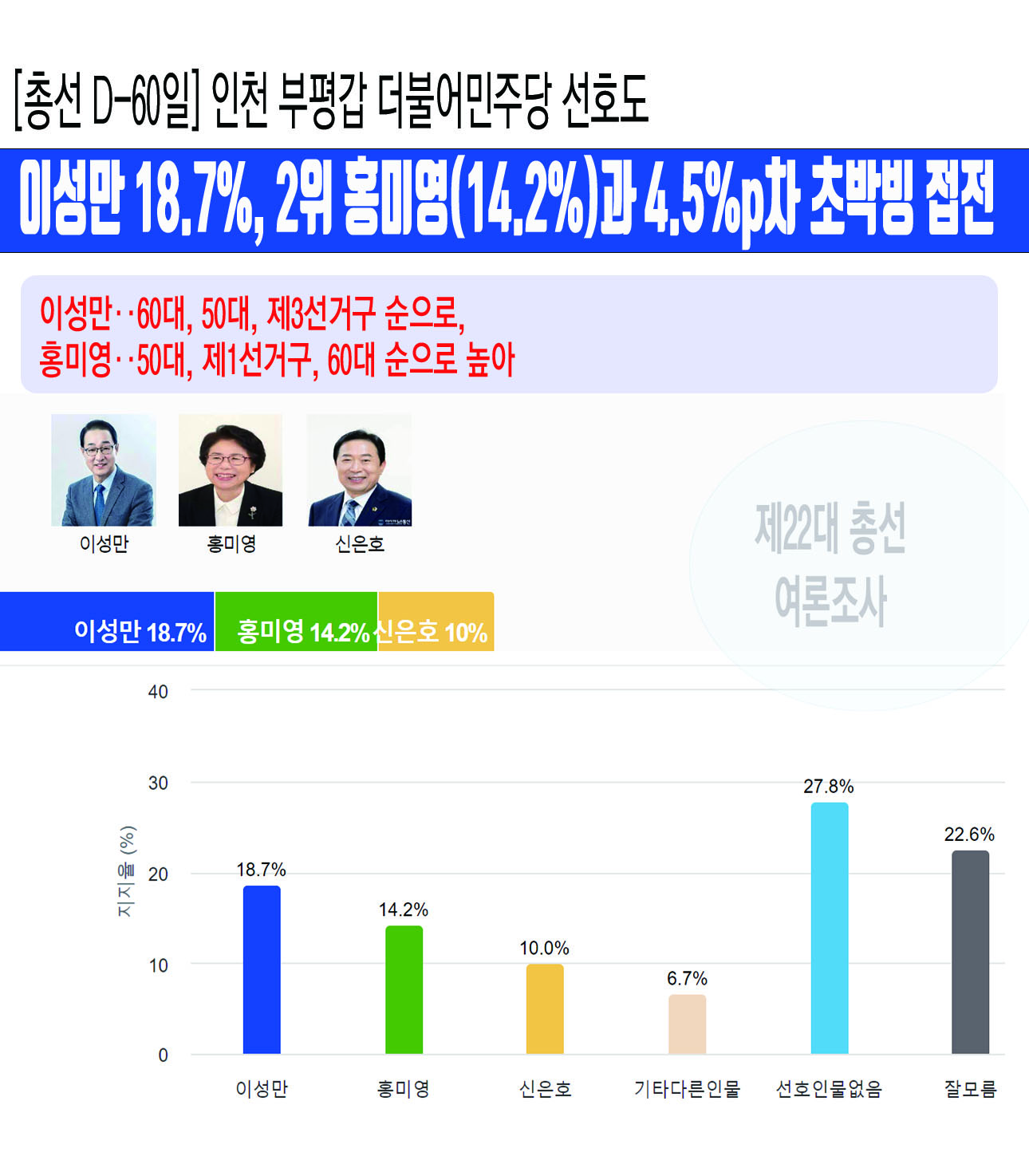 ³»³â Á¦22´ë ±¹È¸ÀÇ¿ø ¼±°Å¸¦ 60ÀÏ ¾ÕµÎ°í Á¶»çµÈ ÀÎõ±¤¿ª½Ã ºÎÆò±¸ °© ¼±°Å±¸ ¡¸´õºÒ¾î¹ÎÁÖ´ç Èĺ¸ ¼±È£µµ¡¹¿©·ÐÁ¶»ç¿¡¼ À̼º¸¸ Çö ±¹È¸ÀÇ¿øÀÌ 18.7%¸¦ ¾ò¾î 14.2%¸¦ ¾òÀº È«¹Ì¿µ Àü Á¦17´ë ±¹È¸ÀÇ¿ø°ú 4.5%p Â÷ÀÌ·Î ÃÊ Á¢ÀüÀ» ¹úÀÌ´Â °ÍÀ¸·Î ³ªÅ¸³µ´Ù.