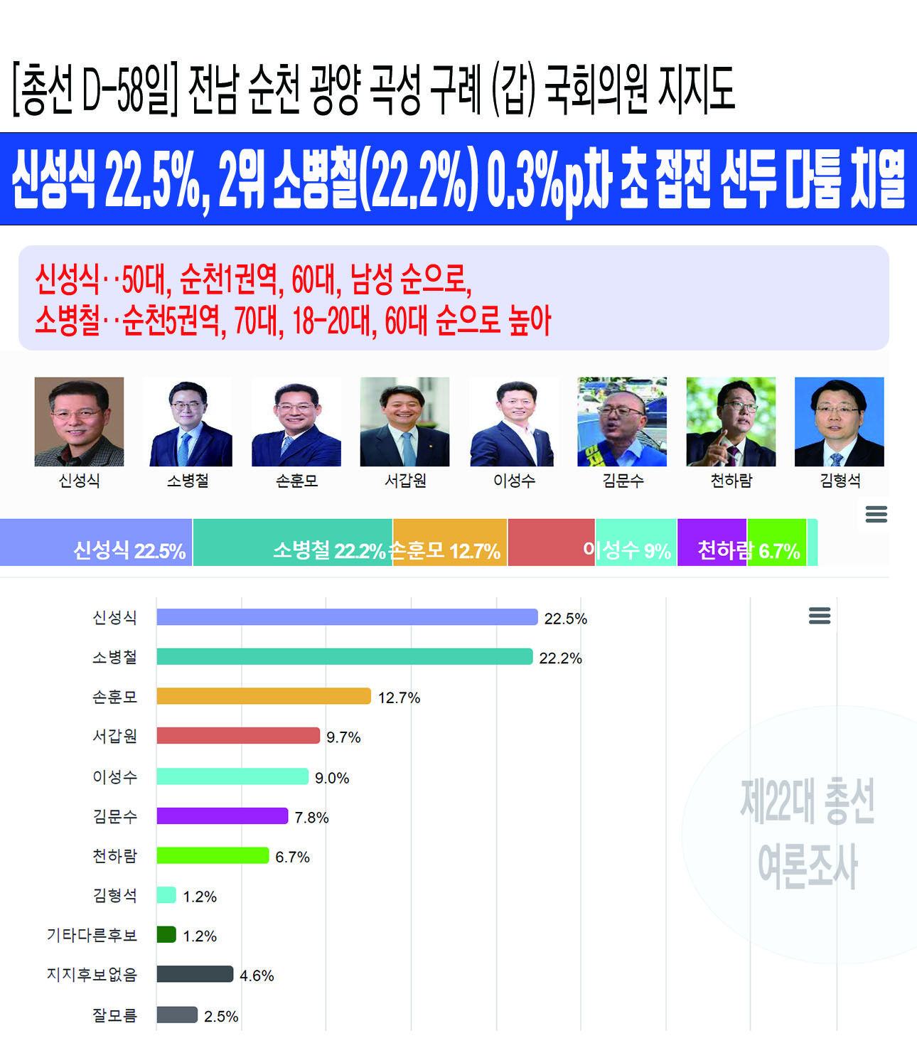 [ÃѼ± D-58ÀÏ] Àü³² ¼øÃµ ±¤¾ç °î¼º ±¸·Ê (°©) ±¹È¸ÀÇ¿ø ÁöÁöµµ¡¤¡¤¡¤½Å¼º½Ä 22.5%, 2À§ ¼Òº´Ã¶(22.2%) 0.3%pÂ÷ ÃÊ Á¢Àü ¼±µÎ ´ÙÅù