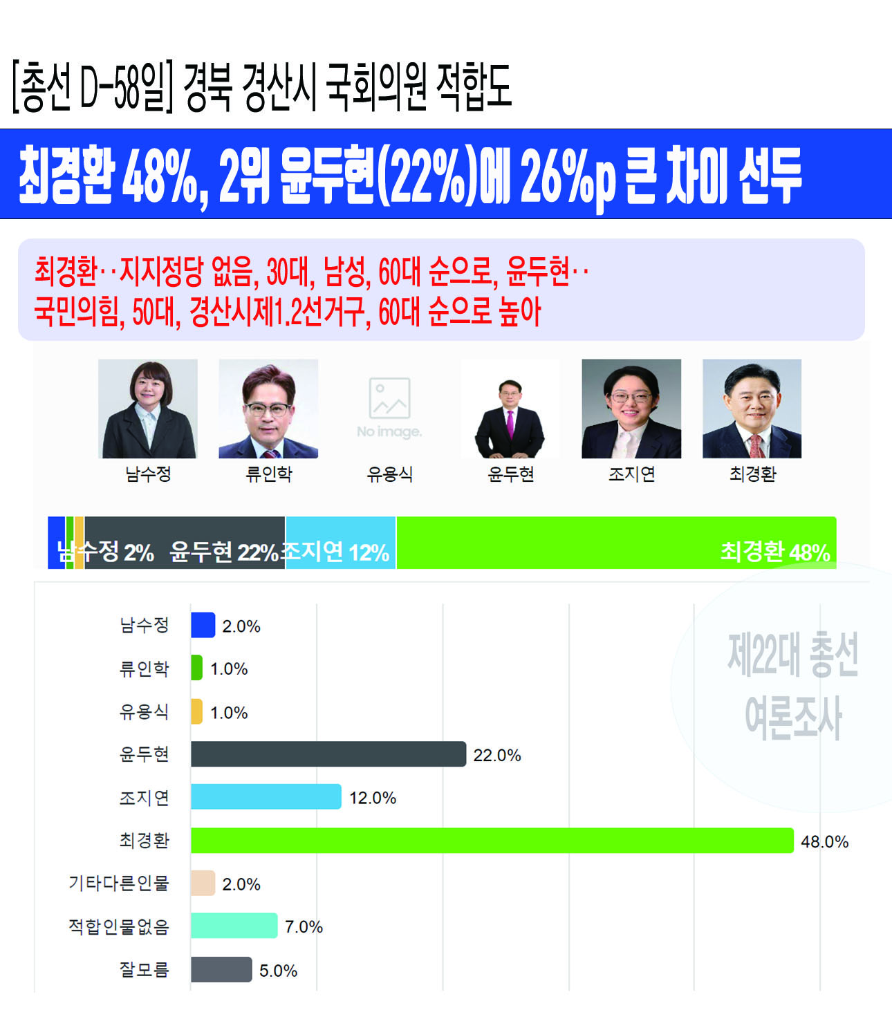 [ÃѼ± D-58ÀÏ] °æºÏ °æ»ê½Ã ±¹È¸ÀÇ¿ø¡¤¡¤¡¤ÃÖ°æÈ¯ 48%, 2À§ À±µÎÇö(22%)¿¡ 26%p Å« Â÷ÀÌ ¼±µÎ