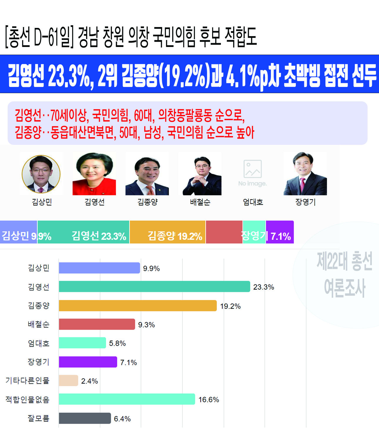 [ÃѼ± D-61ÀÏ] °æ³² â¿ø ÀÇâ ±¹¹ÎÀÇÈû Èĺ¸¡¤¡¤¡¤±è¿µ¼± 23.3%, 2À§ ±èÁ¾¾ç(19.2%)°ú 4.1%pÂ÷ Ãʹںù Á¢Àü ¼±µÎ