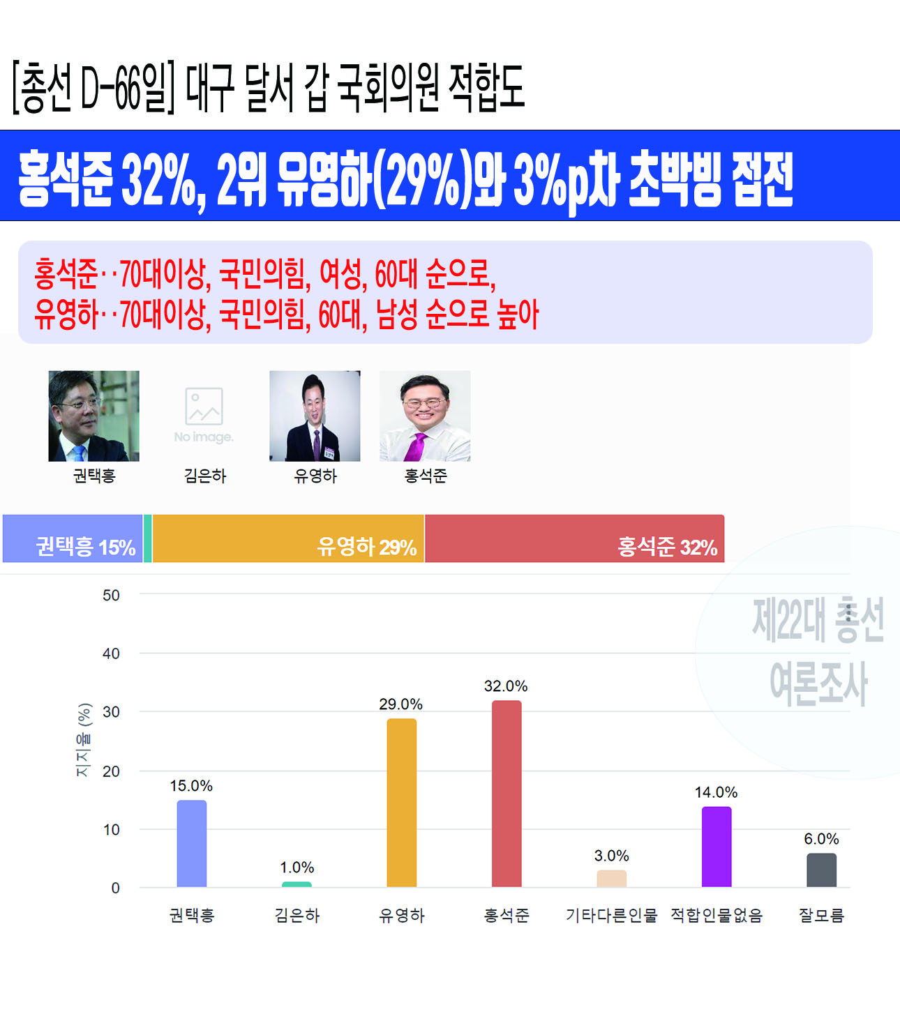 ³»³â Á¦22´ë ±¹È¸ÀÇ¿ø ¼±°Å¸¦ 66ÀÏ ¾ÕµÎ°í Á¶»çµÈ ´ë±¸±¤¿ª½Ã ´Þ¼±¸ °© ¼±°Å±¸ ¡¸¿©-¾ß ±¹È¸ÀÇ¿ø ÀûÇÕµµ¡¹¿©·ÐÁ¶»ç¿¡¼ È«¼®ÁØ Çö ±¹È¸ÀÇ¿øÀÌ 32%¸¦ ¾ò¾î 29%¸¦ ¾òÀº À¯¿µÇÏ Àü ¹Ú±ÙÇý Àü ´ëÅë·É º¯È£ÀÎ¿Í 3%p Â÷ÀÌ·Î ÃÊ Á¢ÀüÀ» ¹úÀÌ´Â °ÍÀ¸·Î ³ªÅ¸³µ´Ù.