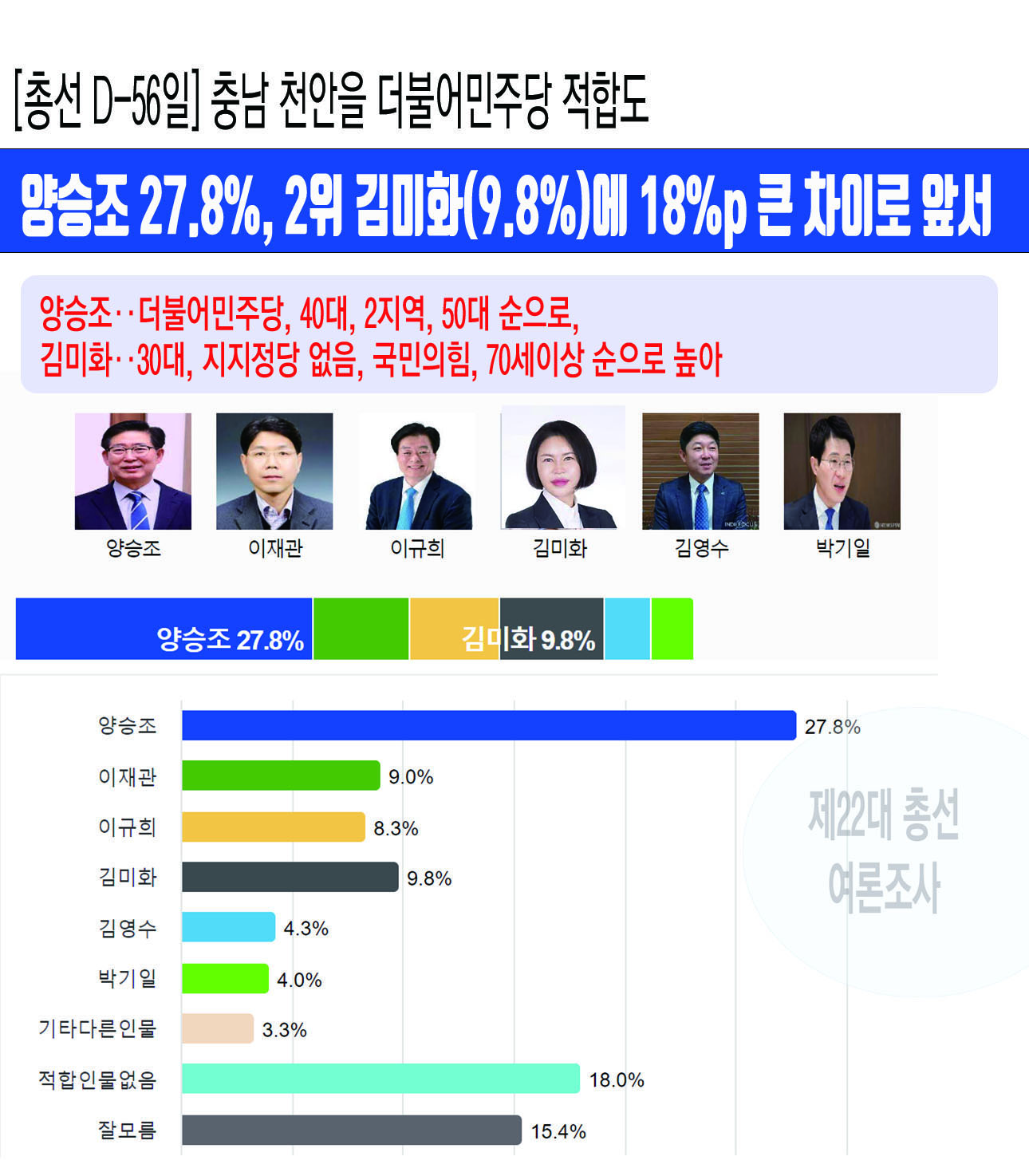³»³â Á¦22´ë ±¹È¸ÀÇ¿ø ¼±°Å¸¦ 56ÀÏ ¾ÕµÎ°í Á¶»çµÈ ÃæÃ»³²µµ õ¾È½Ã À» ¼±°Å±¸ ¡¸´õºÒ¾î¹ÎÁÖ´ç Èĺ¸ ÀûÇÕµµ¡¹¿©·ÐÁ¶»ç¿¡¼ ¾ç½ÂÁ¶ Àü Ãæ³²µµÁö»ç°¡ 27.8%¸¦ ¾ò¾î 9.8%¸¦ ¾òÀº ±è¹ÌÈ Àü õ¾È½ÃÀÇȸ ÀÇ¿øÀ» 18%pÀÇ Å« Â÷ÀÌ·Î ¾Õ¼ ³ª°¡´Â °ÍÀ¸·Î ³ª¿Ô´Ù.