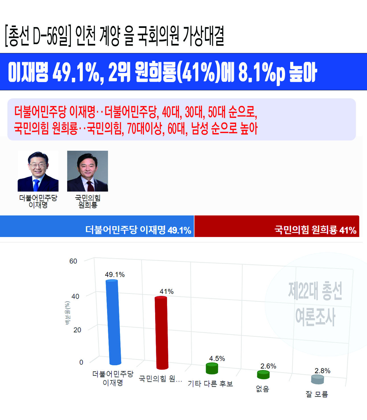 [ÃѼ± D-56ÀÏ] ÀÎõ °è¾ç À» ±¹È¸ÀÇ¿ø¡¤¡¤¡¤´õºÒ¾î¹ÎÁÖ´ç ÀÌÀç¸í 49.1%, 2À§ ±¹¹ÎÀÇÈû ¿øÈñ·æ(41%)¿¡ 8.1%p ³ô¾Æ