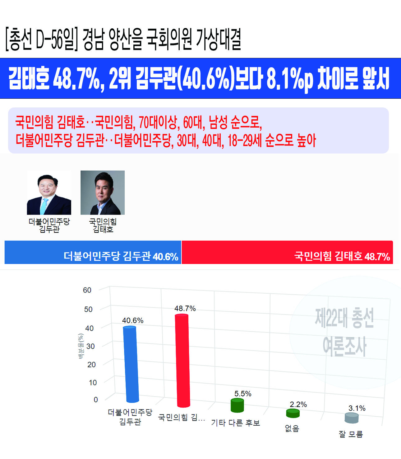 [ÃѼ± D-56ÀÏ] °æ³² ¾ç»êÀ» ±¹È¸ÀÇ¿ø¡¤¡¤¡¤±¹¹ÎÀÇÈû ±èÅÂÈ£ 48.7%, 2À§ ´õºÒ¾î¹ÎÁÖ´ç ±èµÎ°ü(40.6%)º¸´Ù 8.1%p Â÷ÀÌ·Î ¾Õ¼