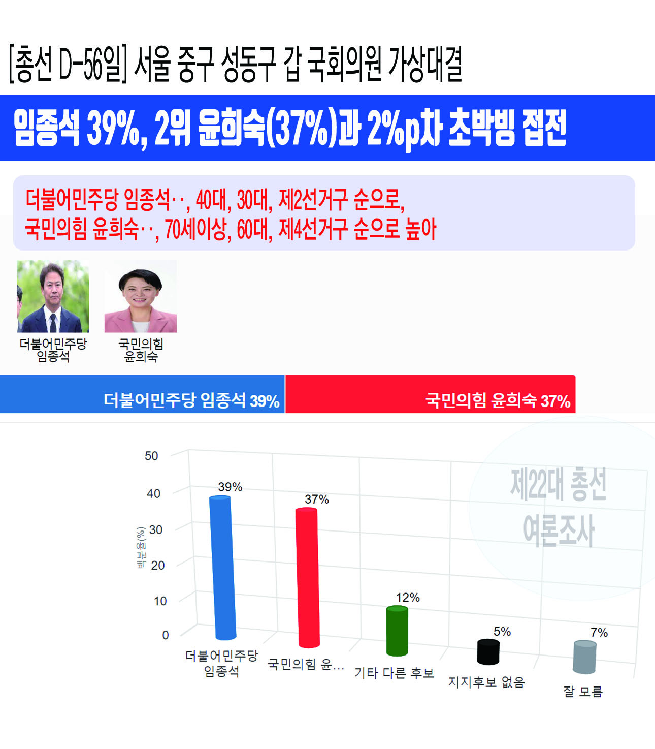 ³»³â Á¦22´ë ±¹È¸ÀÇ¿ø ¼±°Å¸¦ 56ÀÏ ¾ÕµÎ°í Á¶»çµÈ ¼¿ïƯº°½Ã Áß±¸ ¼ºµ¿±¸ °© ¼±°Å±¸ ¡¸ÀÓÁ¾¼® vs À±Èñ¼÷ ¾çÀÚ´ë°á¡¹¿©·ÐÁ¶»ç¿¡¼ '´õºÒ¾î¹ÎÁÖ´ç ÀÓÁ¾¼®' È帰¡ 39%¸¦ ¾ò¾î 37%¸¦ ¾òÀº '±¹¹ÎÀÇÈû À±Èñ¼÷' Èĺ¸¿Í 2%p Â÷ÀÌ·Î ÃÊ ¹ÚºùÀÇ Á¢ÀüÀ» ¹úÀÌ´Â °ÍÀ¸·Î ³ªÅ¸³µ´Ù.