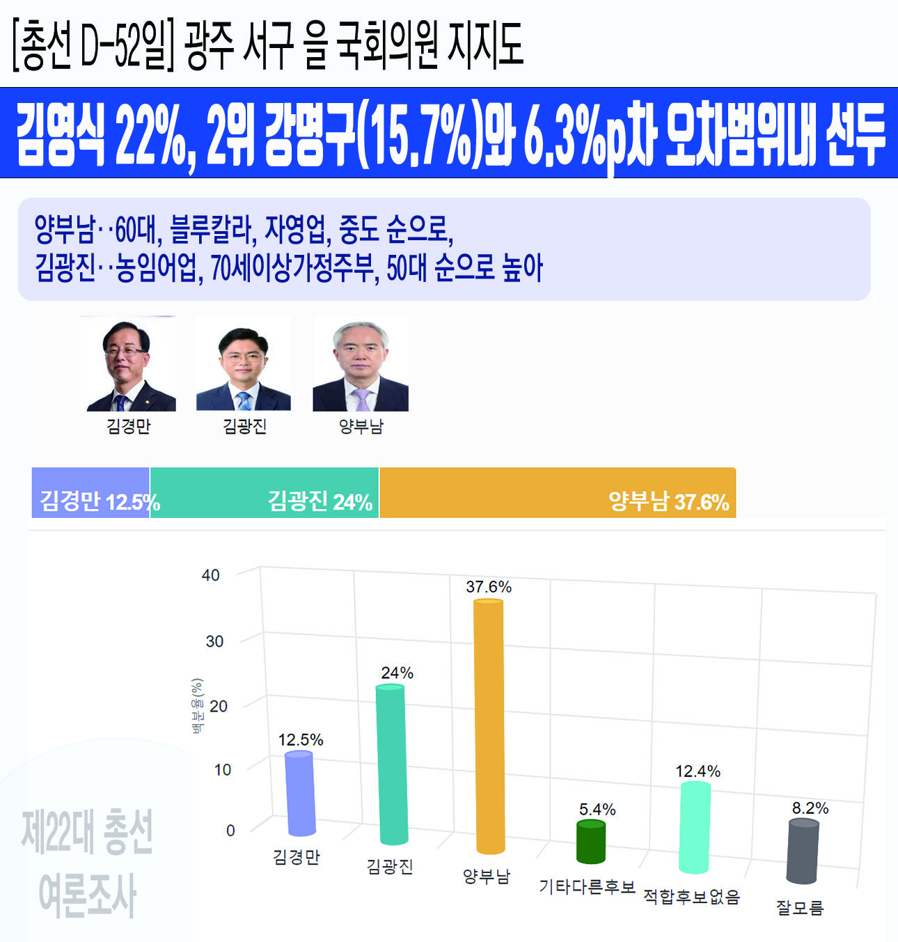 [ÃѼ± D-52ÀÏ] ±¤ÁÖ ¼±¸ À» ±¹È¸ÀÇ¿ø¡¤¡¤¡¤¾çºÎ³² 37.6%, 2À§ ±è±¤Áø(24%)¿¡ 13.6%p Å« Â÷ÀÌ ¼±µÎ
