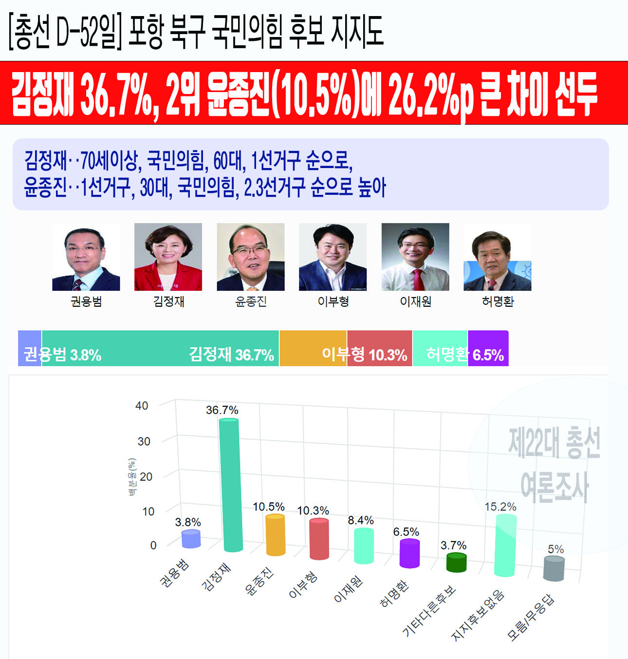 [ÃѼ± D-52ÀÏ] Æ÷Ç× ºÏ±¸ ±¹¹ÎÀÇÈû Èĺ¸¡¤¡¤¡¤±èÁ¤Àç 36.7%, 2À§ À±Á¾Áø(10.5%)¿¡ 26.2%p Å« Â÷ÀÌ ¼±µÎ