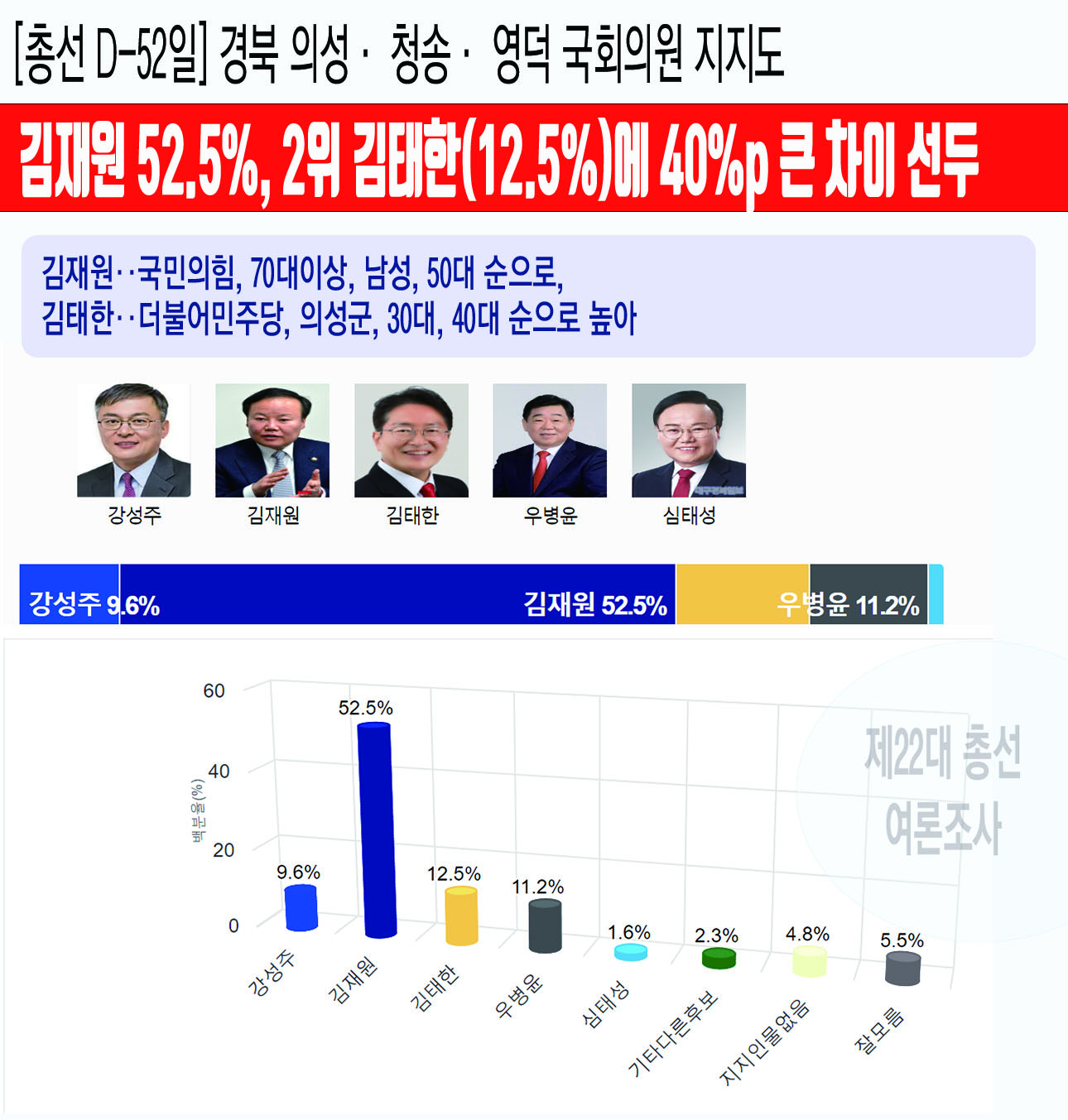 ³»³â Á¦22´ë ±¹È¸ÀÇ¿ø ¼±°Å¸¦ 52ÀÏ ¾ÕµÎ°í Á¶»çµÈ °æ»óºÏµµ ÀǼº±º û¼Û±º ¿µ´ö±º ¼±°Å±¸ ¡¸±¹È¸ÀÇ¿ø ÁöÁöµµ¡¹¿©·ÐÁ¶»ç¿¡¼ ±èÀç¿ø Àü ±¹¹ÎÀÇÈû ÃÖ°íÀÇ¿øÀÌ 52.5%¸¦ ¾ò¾î 12.5%¸¦ ¾òÀº ±èÅÂÇÑ Àü û¿Í´ë ¼±ÀÓ ÇàÁ¤°üÀ» 40%pÀÇ Å« Â÷ÀÌ·Î ¾Õ¼ ³ª°¡´Â °ÍÀ¸·Î ³ª¿Ô´Ù.