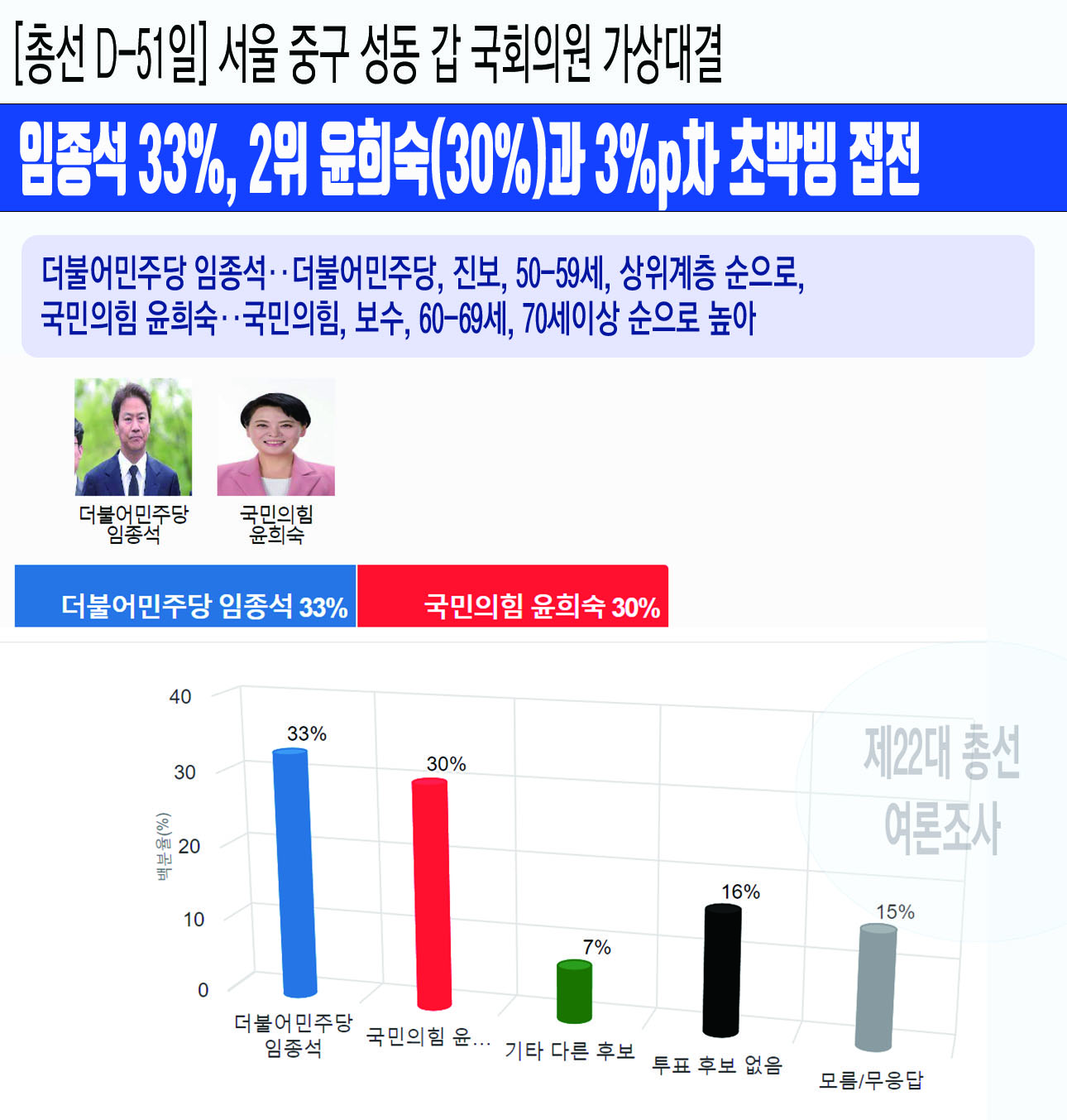 ³»³â Á¦22´ë ±¹È¸ÀÇ¿ø ¼±°Å¸¦ 51ÀÏ ¾ÕµÎ°í Á¶»çµÈ ¼¿ïƯº°½Ã Áß±¸ ¼ºµ¿±¸ °© ¼±°Å±¸ ¡¸ÀÓÁ¾¼® vs À±Èñ¼÷ °¡»ó´ë°á¡¹¿©·ÐÁ¶»ç¿¡¼ ´õºÒ¾î¹ÎÁÖ´ç ÀÓÁ¾¼® Àü û¿Í´ë ºñ¼½ÇÀåÀÌ 33%¸¦ ¾ò¾î 30%¸¦ ¾òÀº ±¹¹ÎÀÇÈû À±Èñ¼÷ Àü ±¹È¸ÀÇ¿ø°ú 3%p Â÷ÀÌ·Î ÃÊ Á¢ÀüÀ» ¹úÀÌ´Â °ÍÀ¸·Î ³ªÅ¸³µ´Ù.