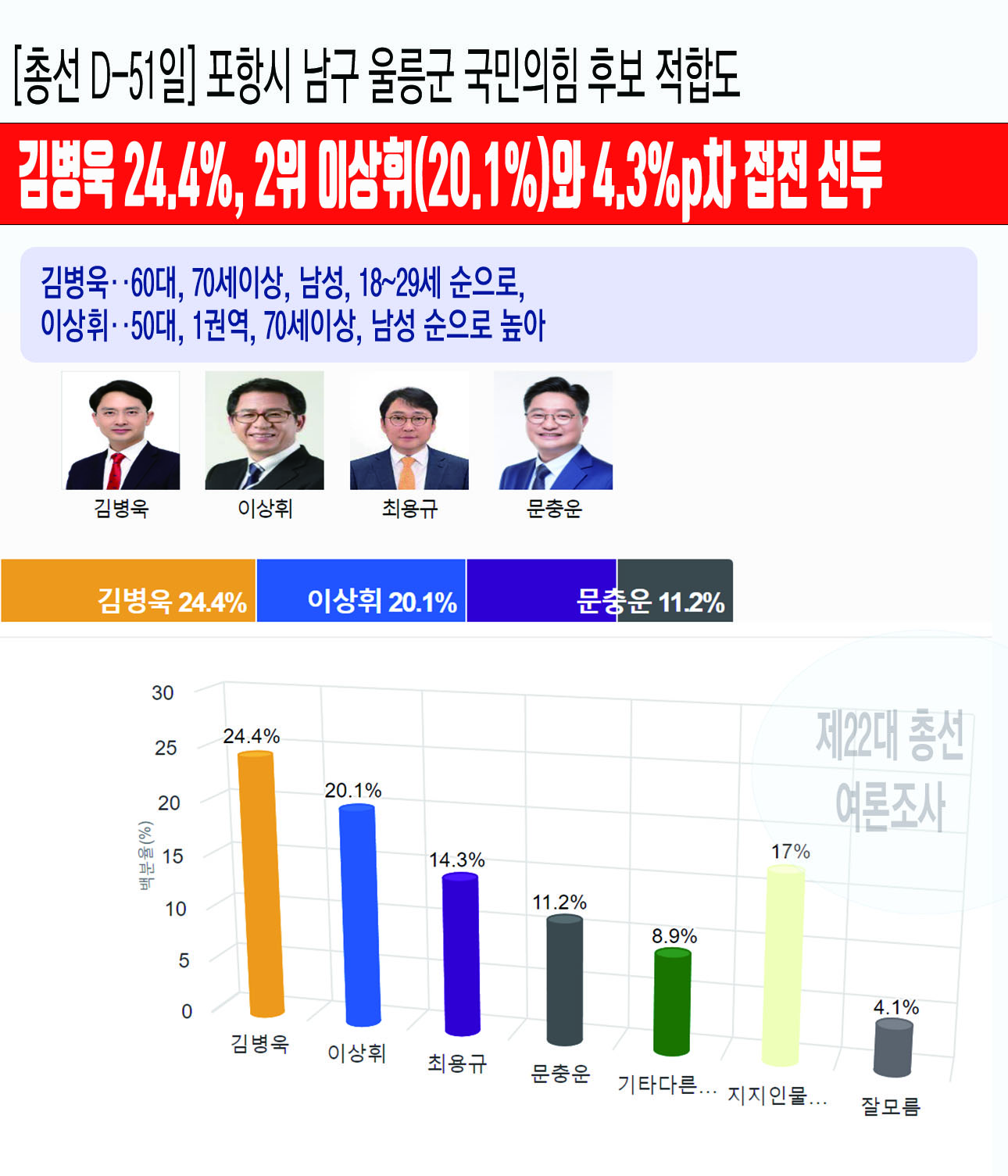 Á¦22´ë ±¹È¸ÀÇ¿ø ¼±°Å¸¦ 51ÀÏ ¾ÕµÎ°í Á¶»çµÈ °æ»óºÏµµ Æ÷Ç׽à ³²±¸ ¿ï¸ª±º ¼±°Å±¸ ¡¸±¹¹ÎÀÇÈû Èĺ¸ ÀûÇÕµµ¡¹¿©·ÐÁ¶»ç¿¡¼­ ±èº´¿í Çö ±¹È¸ÀÇ¿øÀÌ 24.4%¸¦ ¾ò¾î 20.1%¸¦ ¾òÀº ÀÌ»óÈÖ Àü ´ëÅë·É½Ç ÃáÃß°üÀå°ú 4.3%p Â÷ÀÌ·Î ÃÊ Á¢ÀüÀ» ¹úÀÌ´Â °ÍÀ¸·Î ³ªÅ¸³µ´Ù.