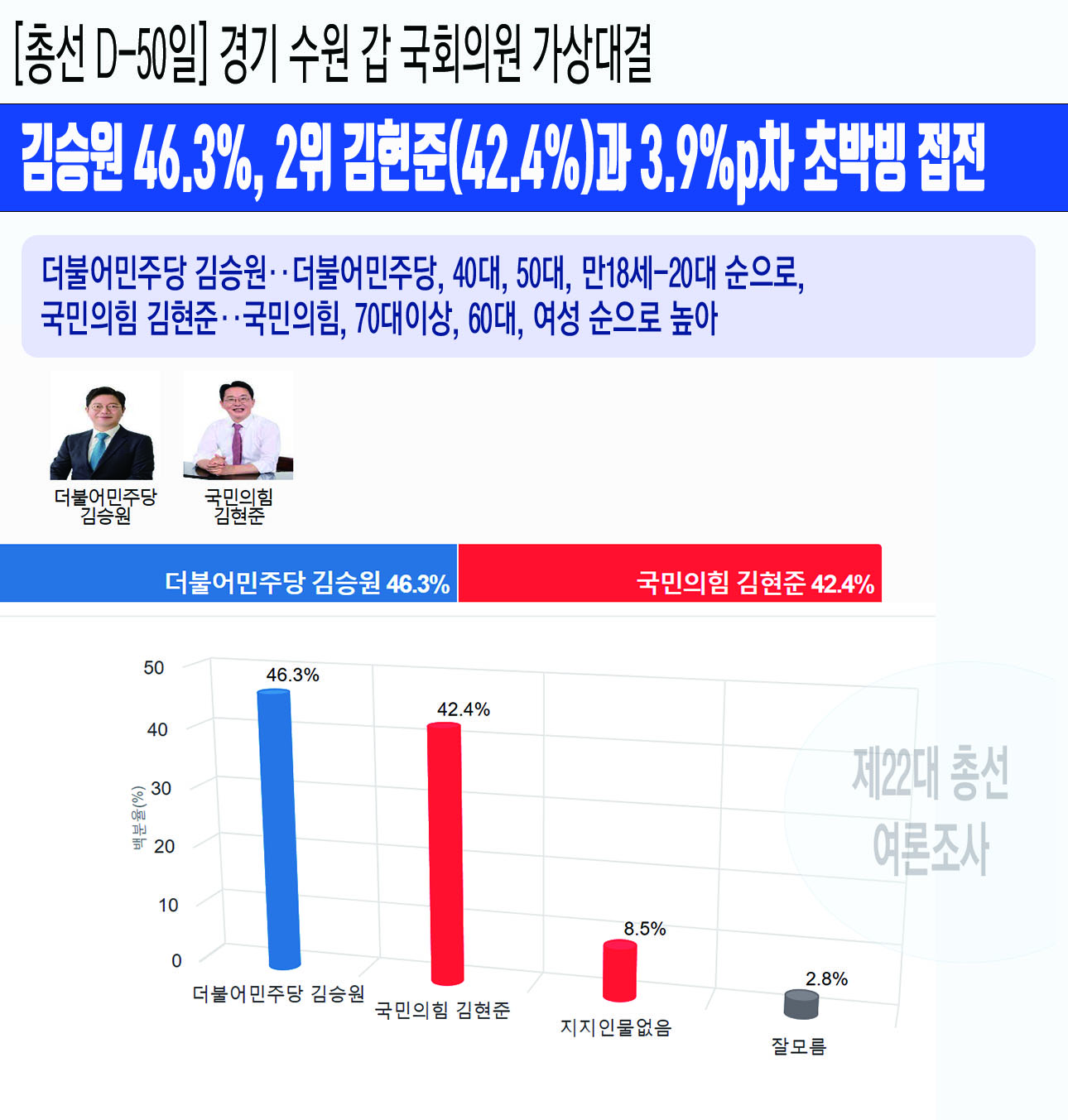 Á¦22´ë ±¹È¸ÀÇ¿ø ¼±°Å¸¦ 50ÀÏ ¾ÕµÎ°í Á¶»çµÈ °æ±âµµ ¼ö¿ø½Ã °© ¼±°Å±¸ ¡¸±è½Â¿ø vs ±èÇöÁØ °¡»ó´ë°á¡¹¿©·ÐÁ¶»ç¿¡¼ ´õºÒ¾î¹ÎÁÖ´ç ±è½Â¿ø Çö ±¹È¸ÀÇ¿øÀÌ 46.3%¸¦ ¾ò¾î 42.4%¸¦ ¾òÀº ±¹¹ÎÀÇÈû ±èÇöÁØ Àü ±¹¼¼Ã»Àå°ú 3.9%p Â÷ÀÌ·Î ÃÊ Á¢ÀüÀ» ¹úÀÌ´Â °ÍÀ¸·Î ³ªÅ¸³µ´Ù.