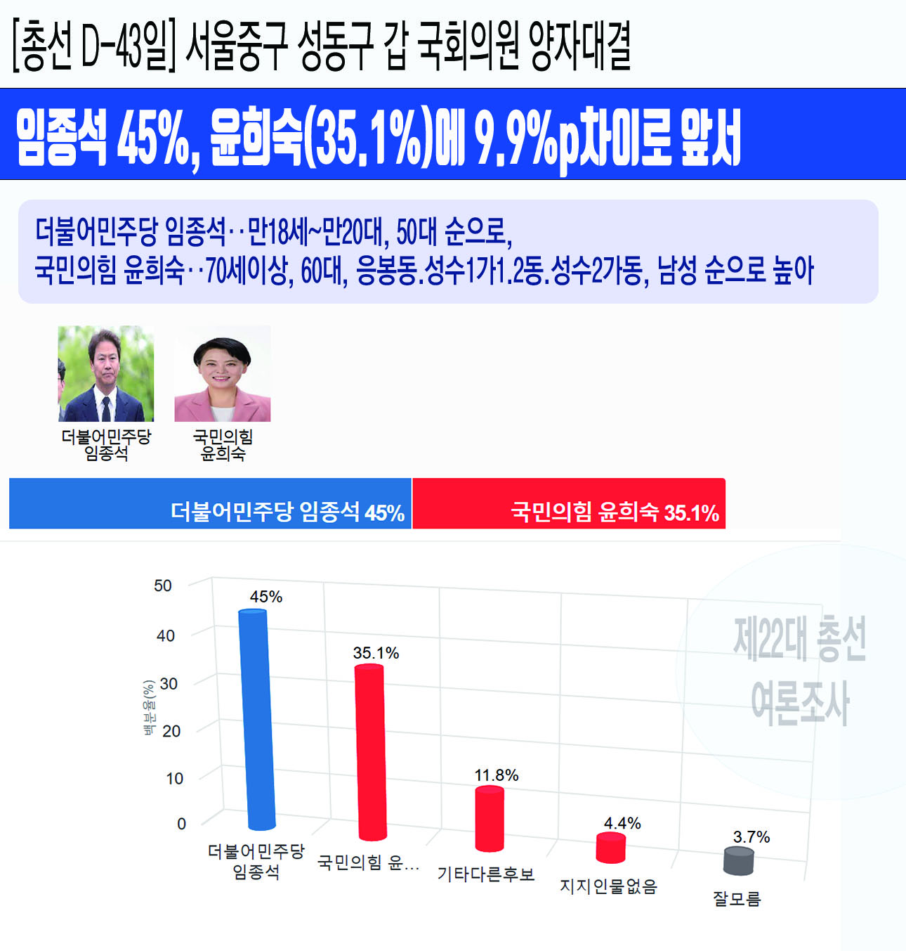 Á¦22´ë ±¹È¸ÀÇ¿ø ¼±°Å¸¦ 43ÀÏ ¾ÕµÎ°í Á¶»çµÈ ¼¿ïƯº°½Ã Áß±¸ ¼ºµ¿±¸ °© ¼±°Å±¸ ¡¸ÀÓÁ¾¼® vs À±Èñ¼÷ °¡»ó´ë°á¡¹¿©·ÐÁ¶»ç¿¡¼ ´õºÒ¾î¹ÎÁÖ´ç ÀÓÁ¾¼® Àü û¿Í´ë ºñ¼½ÇÀåÀÌ 45%¸¦ ¾ò¾î 35.1%¸¦ ¾òÀº ±¹¹ÎÀÇÈû À±Èñ¼÷ Àü ±¹È¸ÀÇ¿øÀ» 9.9%pÀÇ Å« Â÷ÀÌ·Î ¾Õ¼ ³ª°¡´Â °ÍÀ¸·Î ³ª¿Ô´Ù.