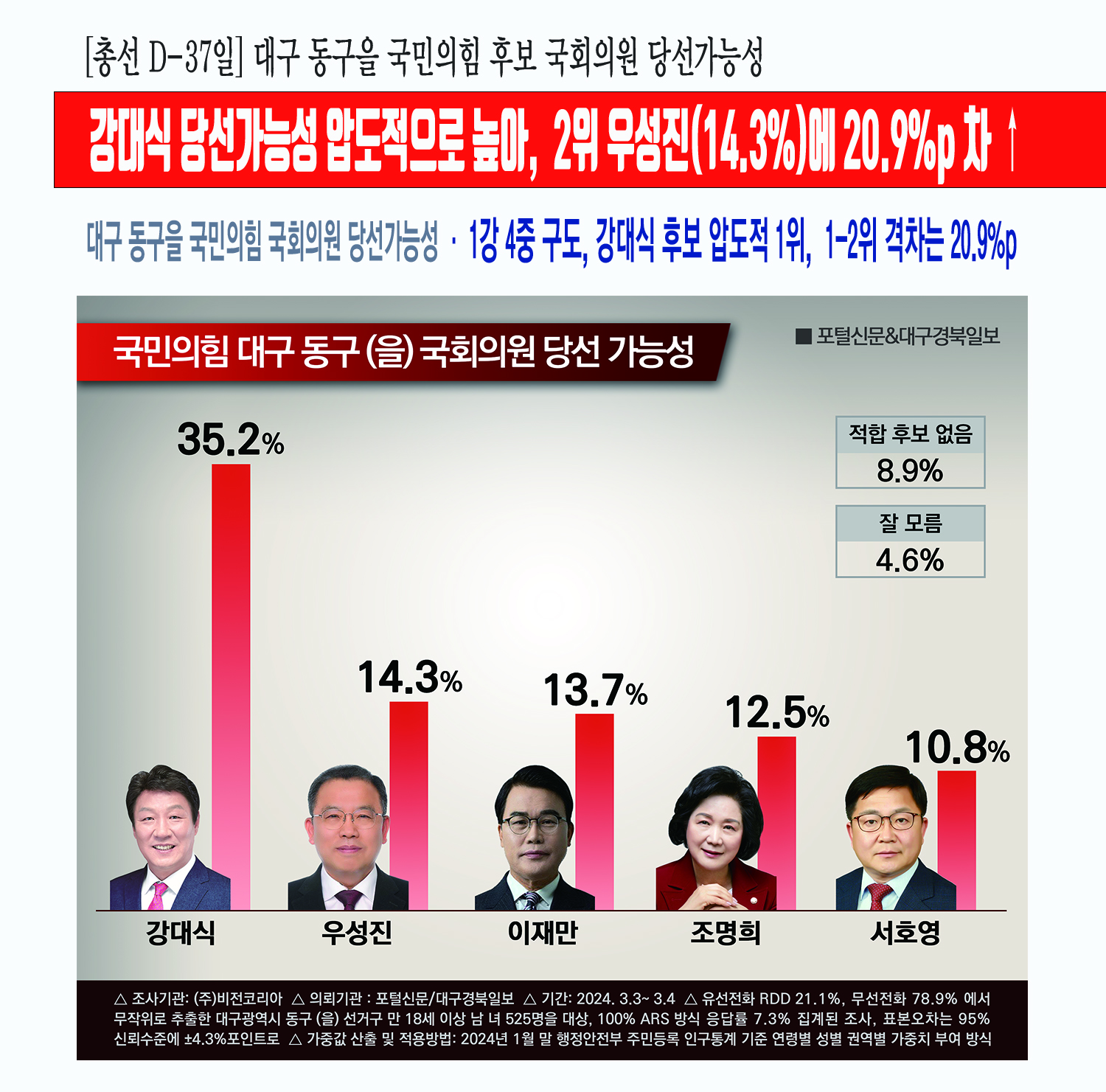 [ÃѼ± D-37ÀÏ] °´ë½Ä ´ç¼±°¡´É¼º ¾ÐµµÀûÀ¸·Î ³ô¾Æ, 2À§ ¿ì¼ºÁø(14.3%)¿¡ 20.9%p Å« Â÷ÀÌ·Î ¾Õ¼ (´ë±¸ µ¿±¸À» ±¹¹ÎÀÇÈû Èĺ¸ ±¹È¸ÀÇ¿ø ´ç¼±°¡´É¼º)