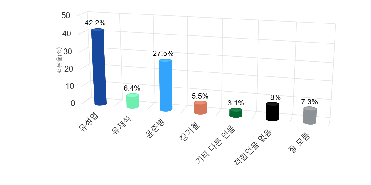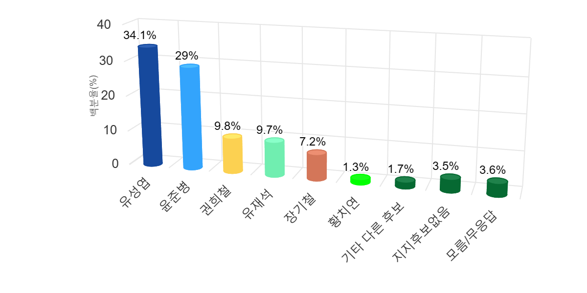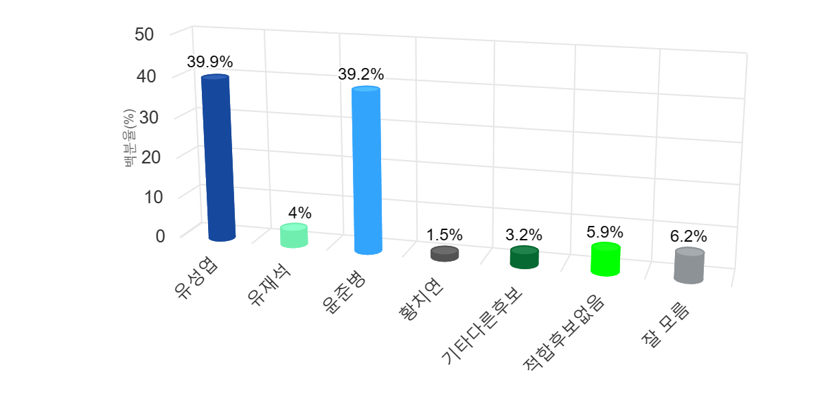 ÀüºÏ Á¤À¾½Ã °íⱺ ±¹È¸ÀÇ¿ø ¡¸´ç¼±°¡´É¼º¡¹ °á°ú´Â 'À¯¼º¿±' È帰¡ 54.3%¸¦ ¾ò¾î 39.6%¸¦ ¾òÀº 'À±Áغ´' È常¦ 14.7%pÀÇ Å« Â÷ÀÌ·Î ¾Õ¼ ³ª°¡´Â °ÍÀ¸·Î ³ª¿Ô´Ù. ¡¸ÀûÇÕÈĺ¸¾øÀ½¡¹3.9%,¡¸Àß ¸ð¸§¡¹2.3%ÀÇ ÀÀ´äµµ ±â·ÏµÇ¾ú´Ù.