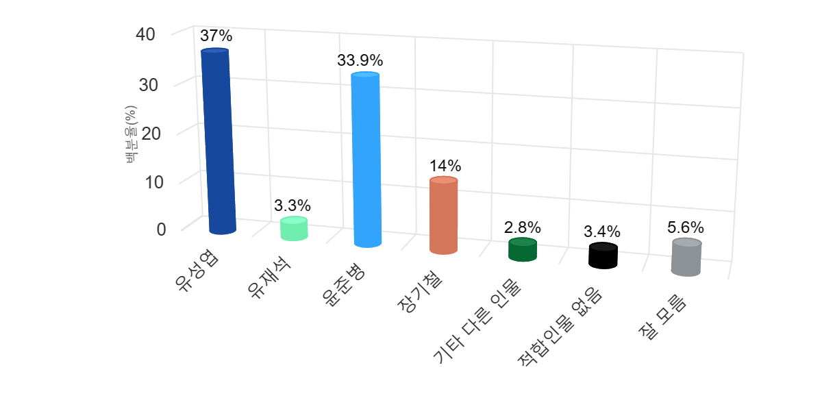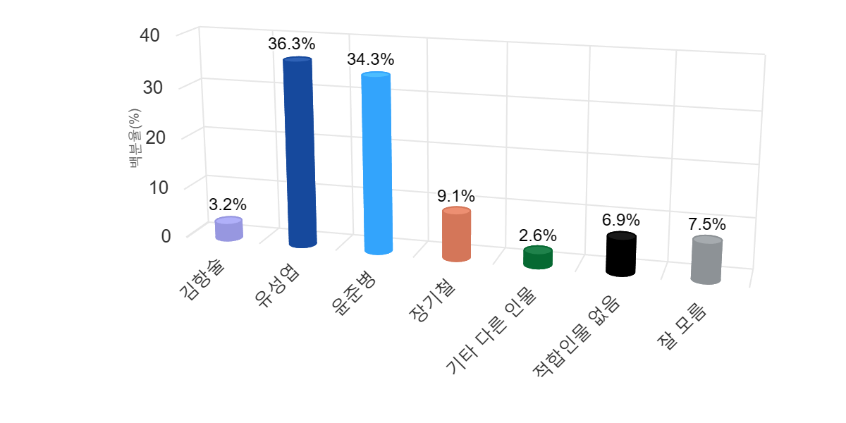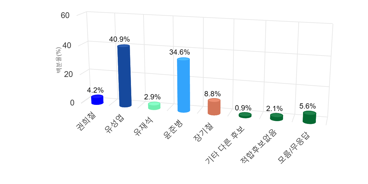 Á¶»ç±â°ü ºñÀüÄÚ¸®¾Æ°¡ 3¿ù 2ÀÏ¿¡¼ 3¿ù 3ÀϱîÁö ÀÌÆ²°£ ½Ç½ÃÇÏ¿© 6ÀÏ ¹ßÇ¥ÇÑ ¡¸´õºÒ¾î¹ÎÁÖ´ç °æ¼± Èĺ¸ ÀûÇÕµµ¡¹Á¶»ç¿¡¼ ¡¸À¯¼º¿±¡¹È帰¡ 54.3%¸¦ ±â·ÏÇÏ¿© 2À§ ¡¸À±Áغ´¡¹Èĺ¸(38.2%)¿¡ 16.1%p Â÷ÀÌ·Î ¼±µÎ¸¦ ÁöŰ´Â °ÍÀ¸·Î ³ªÅ¸³µ´Ù.