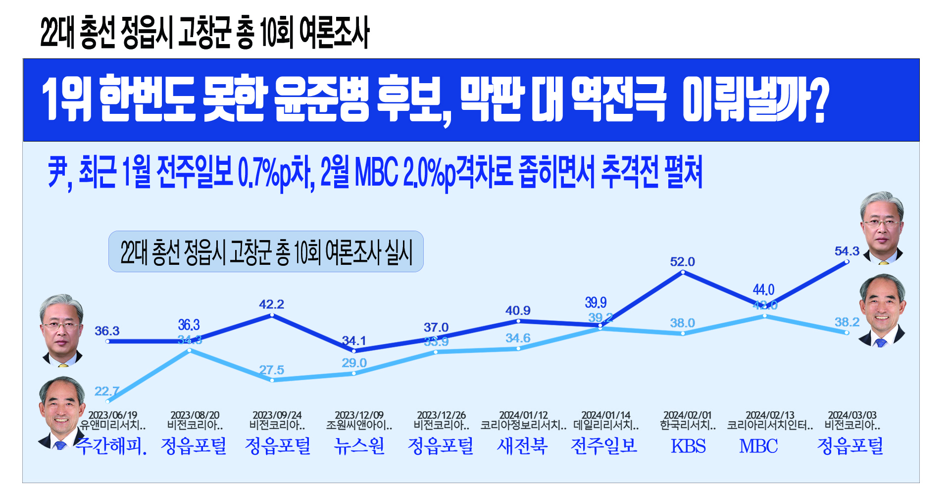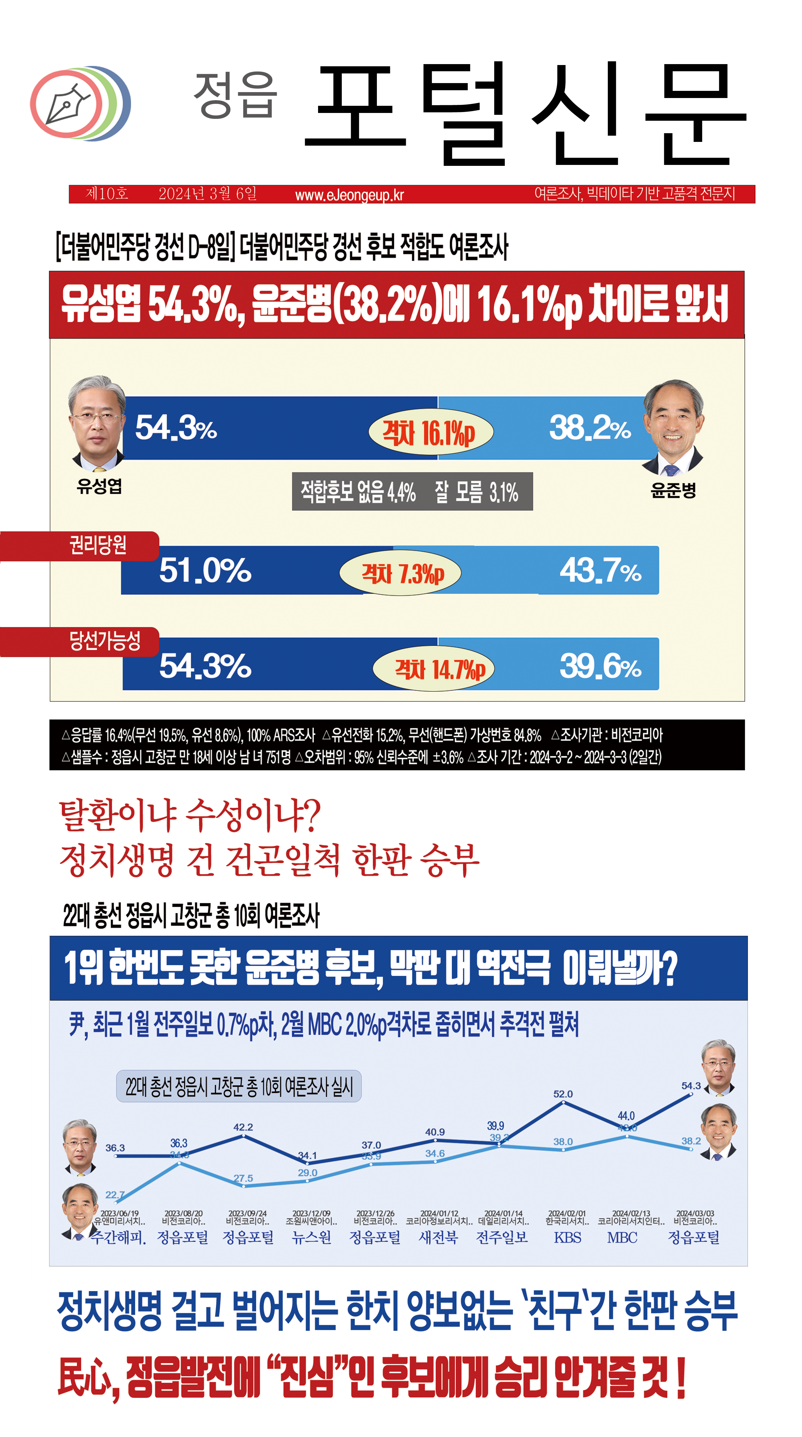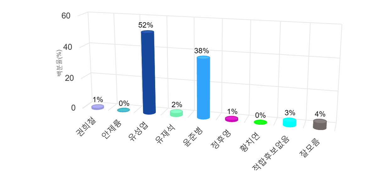 [¹ÎÁÖ´ç °æ¼± D-8ÀÏ] À¯¼º¿± 54.3%, À±Áغ´(38.2%)¿¡ 16.1%p Å« Â÷ÀÌ·Î ¾Õ¼