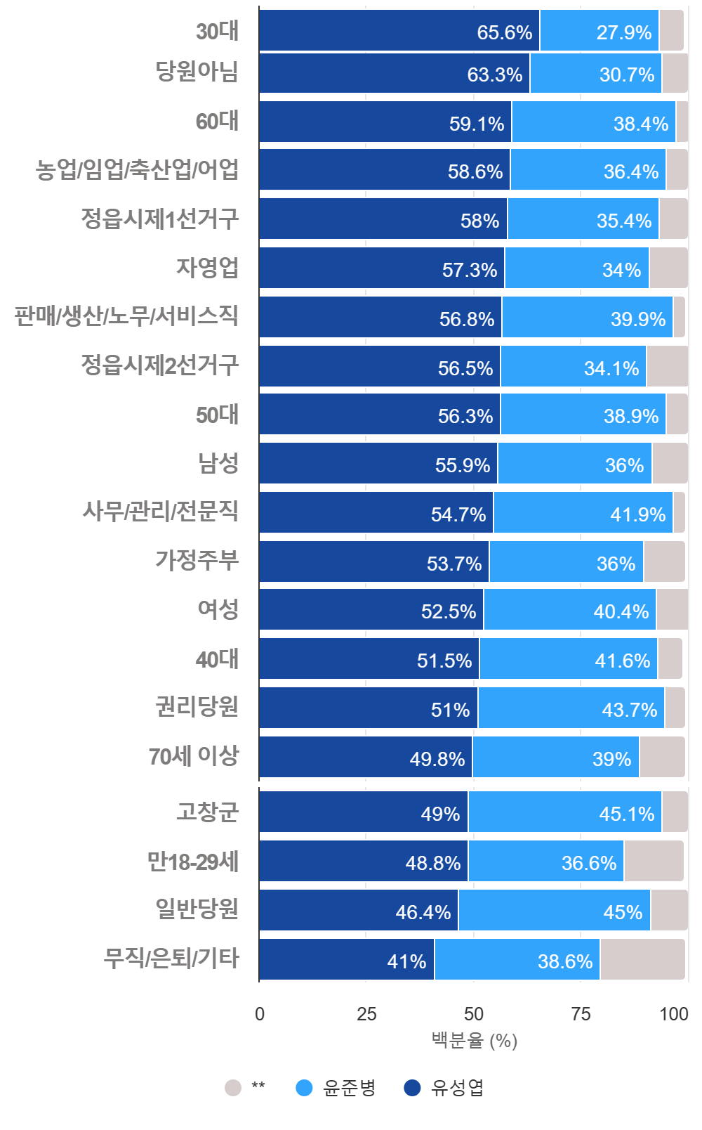 ¡¸À¯¼º¿±¡¹È帴 "Á¤À¾½ÃÁ¦1¼±°Å±¸" Áö¿ª, "Á¤À¾½ÃÁ¦2¼±°Å±¸" Áö¿ª, "³²¼º" , "¿©¼º" , "¸¸18-29¼¼" ¿¬·ÉÃþ, "30´ë" ¿¬·ÉÃþ, "50´ë" ¿¬·ÉÃþ, "60´ë" ¿¬·ÉÃþ, "70¼¼ ÀÌ»ó" ¿¬·ÉÃþ, "»ç¹«/°ü¸®/Àü¹®Á÷" Á÷¾÷±º, "ÆÇ¸Å/»ý»ê/³ë¹«/¼ºñ½ºÁ÷" Á÷¾÷±º, "°¡Á¤ÁÖºÎ" Á÷¾÷±º, "ÀÚ¿µ¾÷" Á÷¾÷±º, "³ó¾÷/ÀÓ¾÷/Ãà»ê¾÷/¾î¾÷" Á÷¾÷±º¿¡¼ 2À§¸¦ Â÷ÁöÇÑ ¡¸À±Áغ´¡¹È常¦ 10%p ÀÌ»ó Å« Â÷ÀÌ·Î µûµ¹¸®¸ç ³ôÀº ÁöÁö¸¦ ¹Þ¾Ò´Ù.
