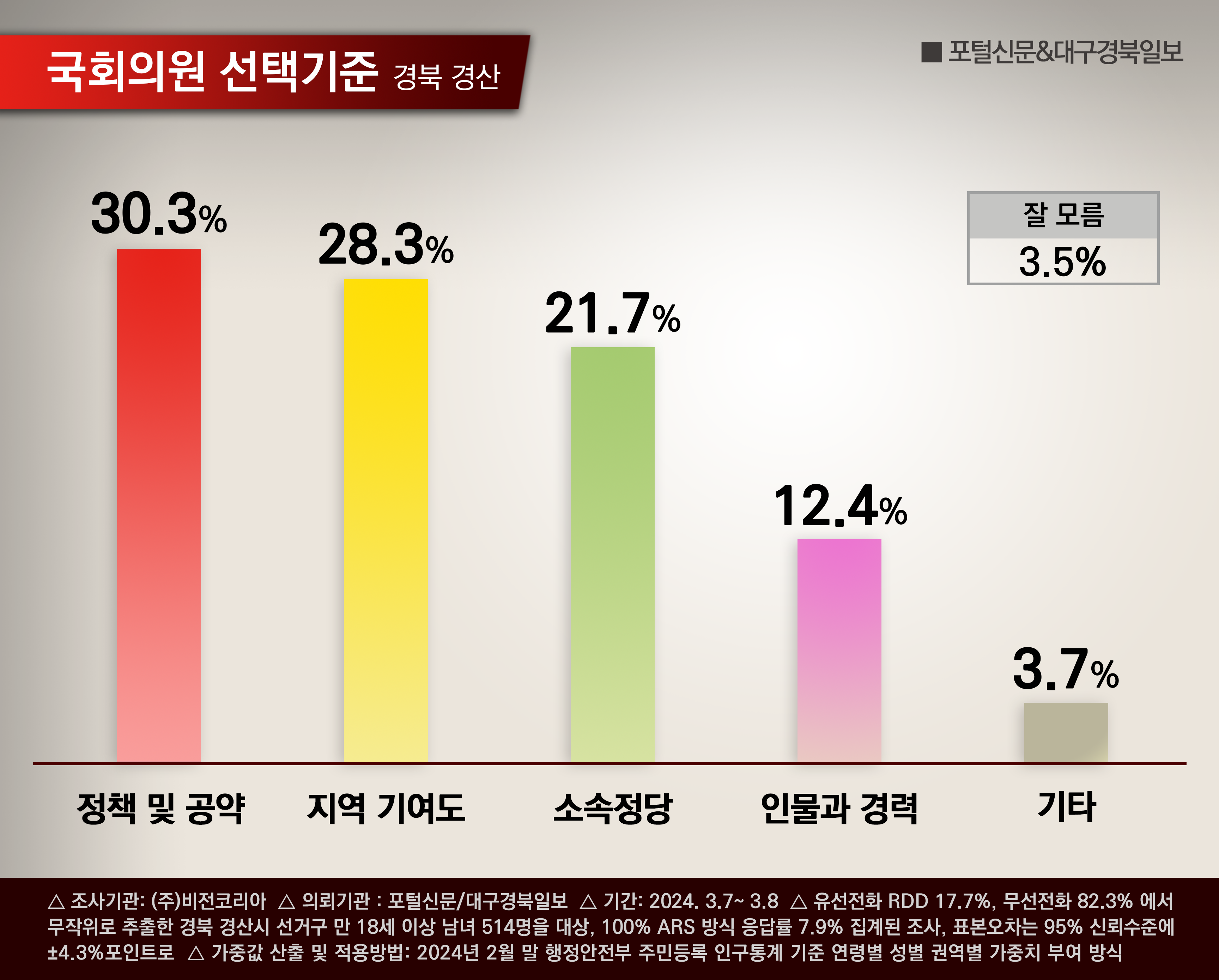 [ÃѼ± D-33ÀÏ] °æºÏ °æ»ê½Ã ±¹È¸ÀÇ¿ø Èĺ¸ ¼±Åà ±âÁØ¡¤¡¤¡¤Á¤Ã¥ ¹× °ø¾à 30.3%, Èĺ¸ÀÇ Áö¿ª ±â¿©µµ 28.3%·Î ³ô°Ô ³ªÅ¸³ª